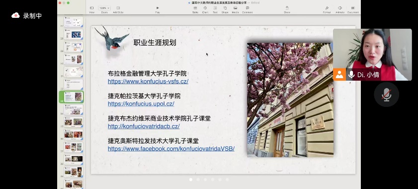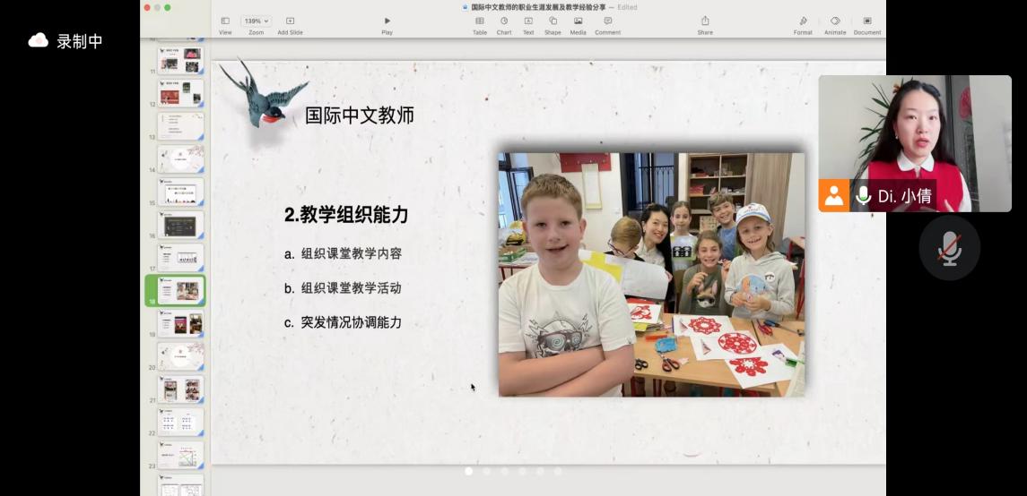 2023年3月17日,“缙云知华”大讲坛第十七期学术沙龙通过腾讯会议的形式在线上成功举办。讲座以“国际中文教师的职业生涯发展及教学经验分享”为主题,邀请公司优秀员工、捷克布拉格金融管理大学孔子公司文化协调员兼汉语教师、《欧洲时报》捷克办事处主任和布拉格泓蒙汉学堂副董事长狄小倩老师为主讲人,公司汉教系主任杨甜老师及汉语国际教育硕士研究生聆听讲座。