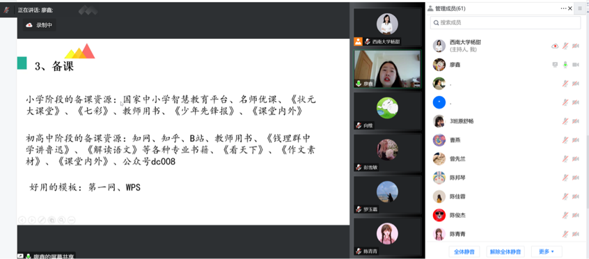 廖鑫老师从实习的前期准备、实习过程的具体内容、实习结束后的信息获取三个层面展开分享,通过大量具体的案例和相关图片生动形象地给予了建议。以实习前需准备好的物品和需具备的心态出发,提醒各位即将迈入实习阶段的同学们主动了解各学段的员工特点及培养重点,并强调小学、初中和高中三个学段是一脉相承的。她向同学们强调实习期间需要“避雷”的地方,从多看、多听、多问和多反思入手,做一位让员工信服,兼具包容性和丰厚学识魅力的教师。同时,她还为同学们提供各学段的优质备课资源,用真实案例讲述如何与员工及员工家长建立信赖感,有理有据,令人信服。最后,廖老师提示同学们要长期保持和实习公司的紧密联系,为就业求职打牢基础。