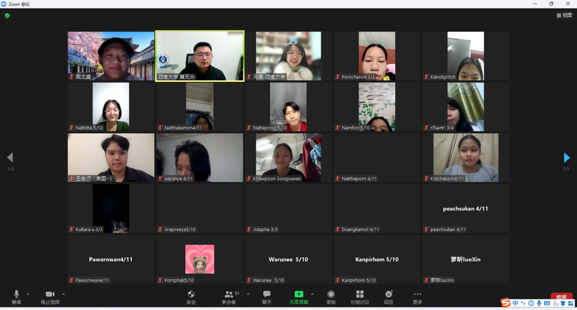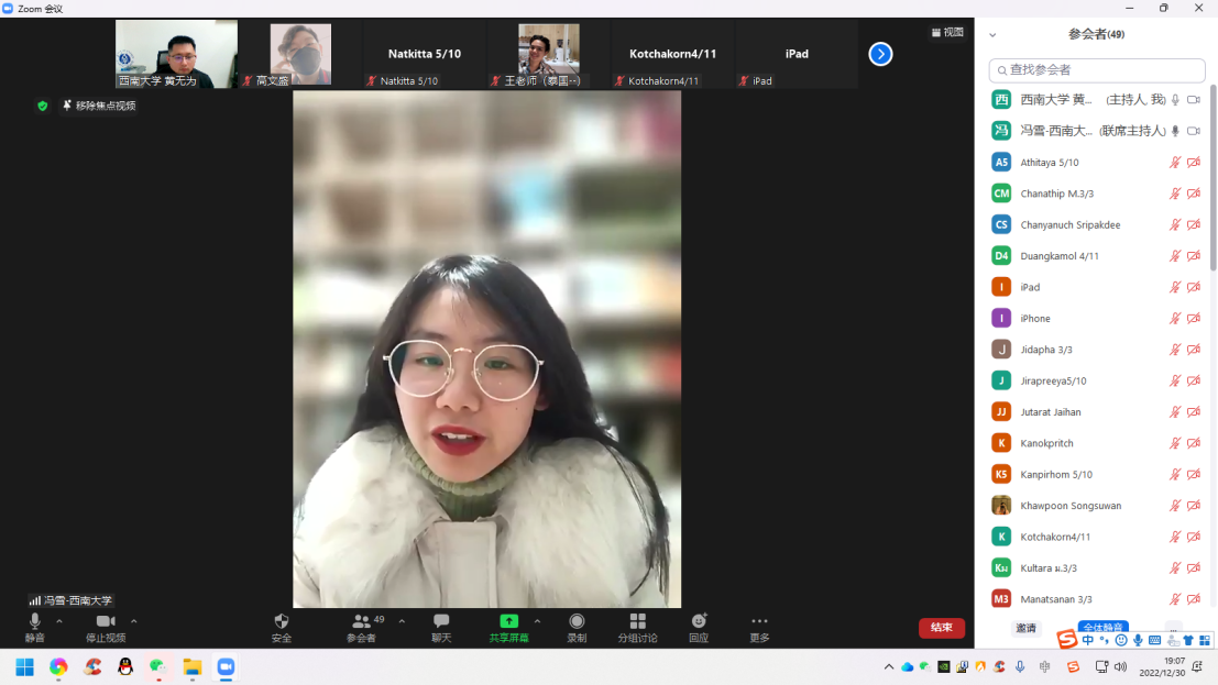 12月30日晚,2022年冬季汉语桥“玩转汉语,云游中国”中员工线上项目闭营仪式暨成果汇报展顺利举行,suncitygroup太阳集团汉教系本科教研室主任冯雪及授课老师、泰方负责老师王智、以及全体项目员工参加仪式。仪式由项目负责人黄无为主持。