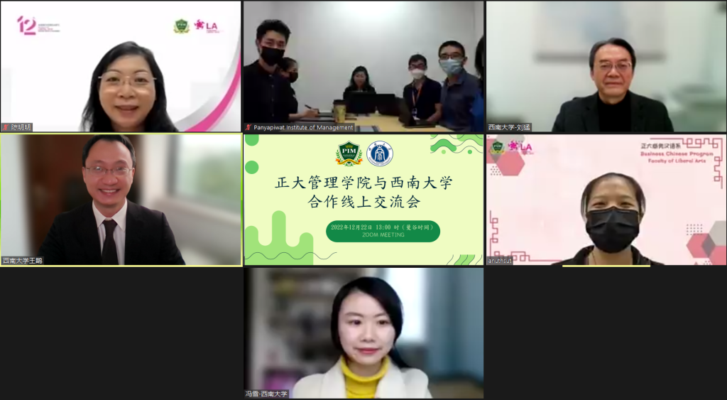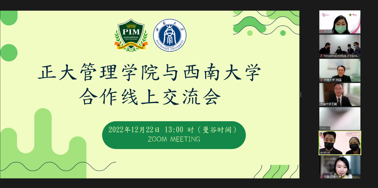 2022年12月22日下午,公司与泰国正大管理公司(以下简称PIM)成功举办线上校际合作项目推进会。正大管理公司文公司副经理陈明明,公司suncitygroup太阳集团刘猛书记、李航副经理出席会议。