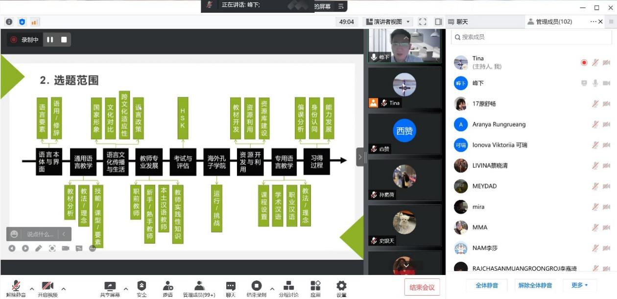 2022年5月30日晚,缙云知华大讲坛第十三期学术沙龙通过腾讯会议在线上举办。华东师范大学舒敬斌博士受邀主讲,教师代表、汉语国际教育中外硕士研究生100余人参加。讲座由公司汉语国际教育系主任杨甜副教授主持。