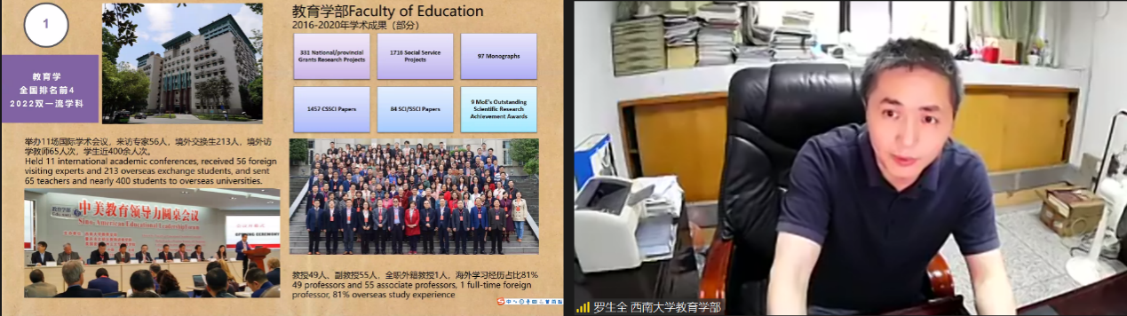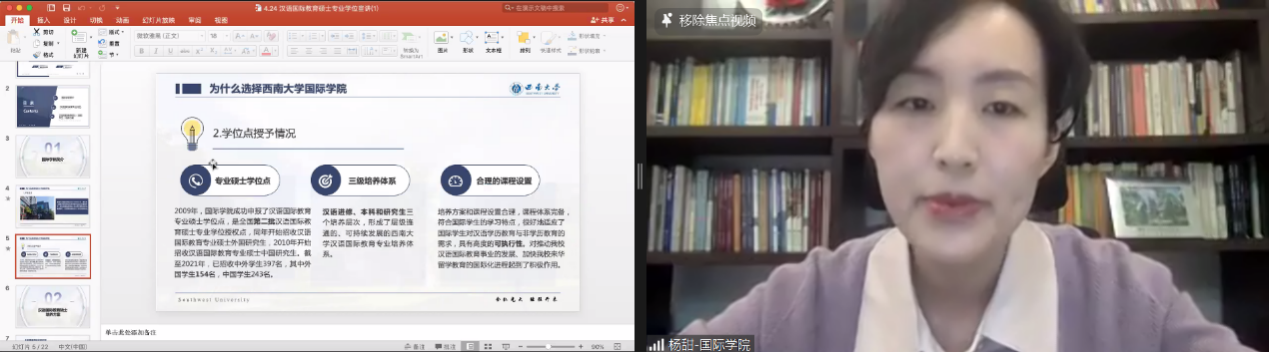 suncitygroup太阳集团外国员工招生办公室王鹊通过视频和PPT扼要介绍重庆和suncitygroup太阳集团,重点讲解国际中文教师奖学金申请和选择suncitygroup太阳集团的四大理由,即生活费标准在重庆“价值更高”、预录取授予率超96%、合作项目名额优先投放、“一带一路本土汉语教师提升项目”优先支持。