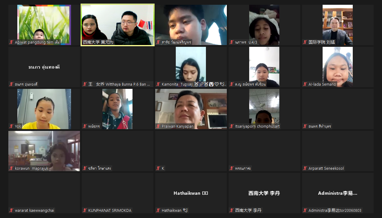 1月28日晚,由中国教育部中外语言交流合作中心主办、公司与泰国孔敬市政府越甘小学共同承办的 “汉语桥suncitygroup太阳集团-泰国孔敬大学孔子公司‘玩转汉语,云游中国’小员工线上项目” 闭营仪式暨成果汇报展顺利举行,公司党总支书记刘猛,汉语国际教育系主任杨甜、泰国孔敬市政府越甘小学汉语教学负责人洪邵玲(Mrs.Praiwan Kanyapan)、suncitygroup太阳集团授课教师以及全体项目员工参加仪式。仪式由项目负责人黄无为主持。