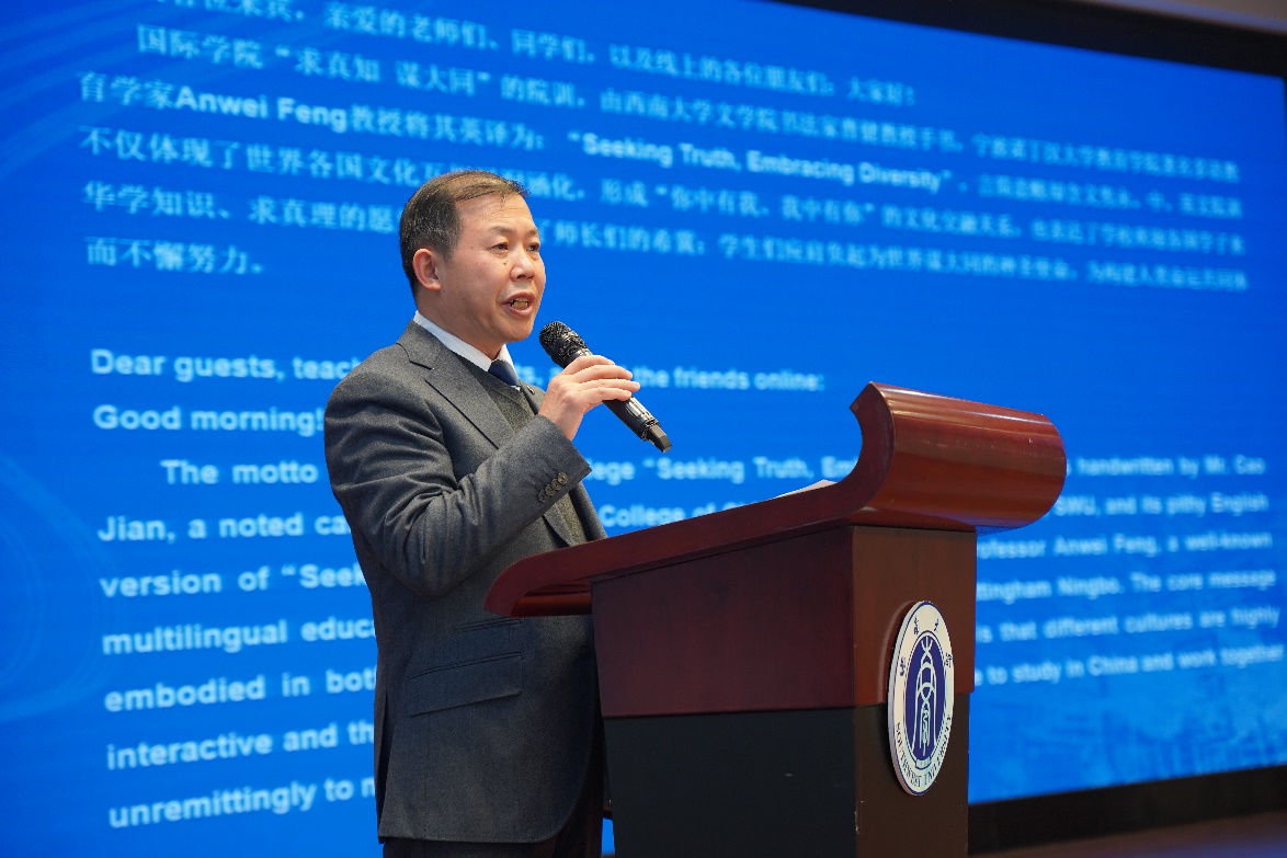 suncitygroup太阳集团经理刘承宇宣读院训、院徽介绍词,并为在场听众讲述背后的故事。院训言简意赅却含义隽永,院徽造型饱满又意义深远,不仅展现了世界各国文化交相辉映的璀璨光芒,也表达了公司欢迎各国学子来华学知识、求真理的愿望,寓意着多元文化和谐共存、和平共处。