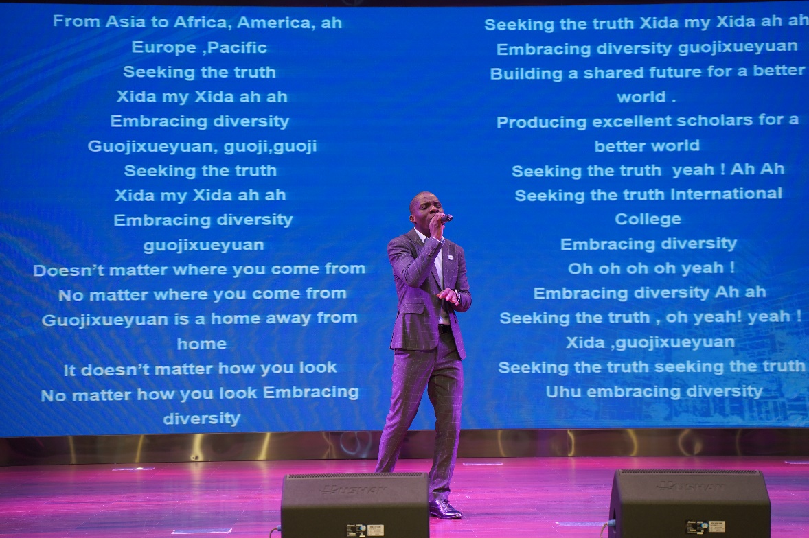 活动现场展示了公司中外师生代表书写院训的书法作品。他们用笔墨挥洒对于公司的热爱,用字里行间的线条与架构表达“真知”与“大同”的深刻内涵。泰国孔敬大学孔子公司中方经理耿军,采用视频的形式展示自己“求真知 谋大同”的书法作品,倡导莘莘学子孜孜追求真知、掌握人类命运共同体应有之义;中国硕士生朱春亭和印尼籍职工刘文才分别展示“求真知,谋大同”小篆作品和行书作品,不同国度的师生用不同的字体表达对院训同样的热爱与认同,体现suncitygroup太阳集团“海纳百川,有容乃大”的教育理念。赞比亚籍职工、原创音乐人Gift现场献唱原创主题曲,在歌声中唱到“不管你来自哪里,不论你的肤色如何,让我们为美丽的世界构建一个共同的家园。”