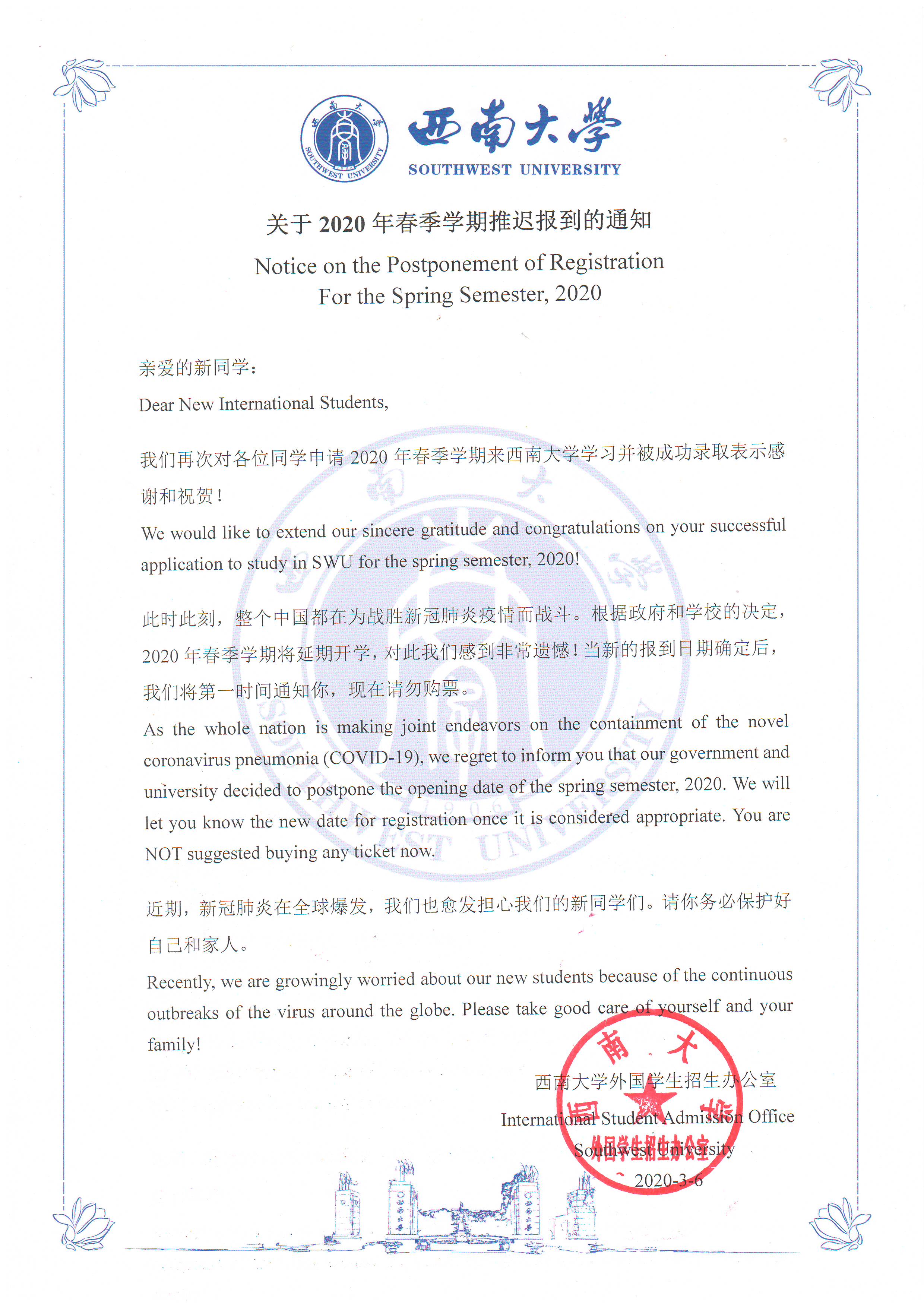 公司通过网站公告、微信群发、邮件通知等多种方式发布中英文官方消息,确保通知到每一名新生,明确要求员工在未接到公司正式开学通知前不得提前来校。截至目前,无一新生提前来校,各项目合作院校对公司防疫工作表示充分理解与大力支持。