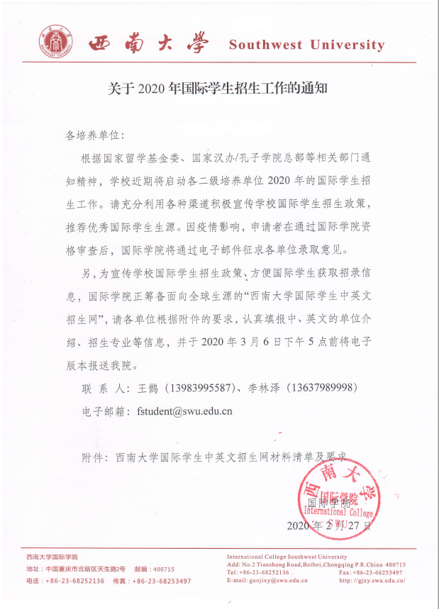 三是加强工作沟通。向公司各二级培养单位发布《关于2020年国际员工招生工作的通知》,提前部署谋划公司招生工作。