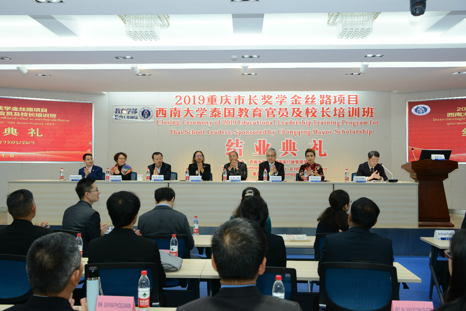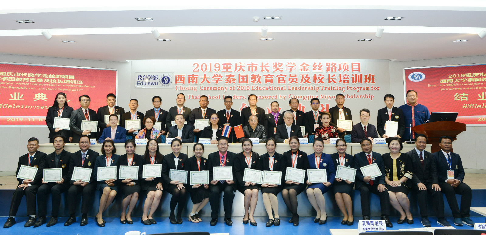 11月5日上午,2019年重庆市长奖学金丝路项目---“suncitygroup太阳集团泰国教育官员及董事长培训班”结业典礼在教育学部举行。泰国教育部次长杜丽亚、泰国教育行政管理公司经理萨蔡童、suncitygroup太阳集团董事长助理褚远辉、教育学部部长朱德全、suncitygroup太阳集团经理王静出席典礼,项目班主任和相关工作人员,以及30位来自泰国的教育官员与职业院校、中小学董事长参加典礼。