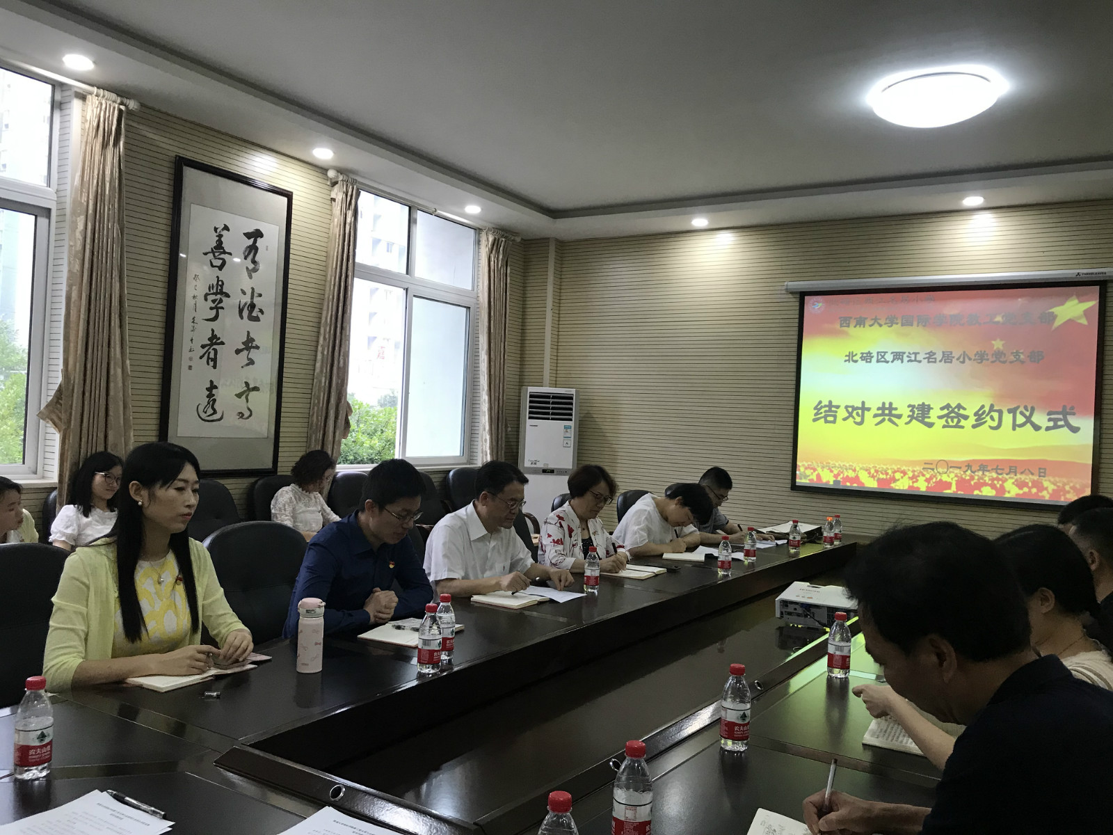 2019年7月8日上午,suncitygroup太阳集团教工党支部与北碚区两江名居小学党支部,在两江名居小学会议室举行了共建协议签署仪式。公司党总支书记刘猛同志、党总支副书记王静同志,党总支委员、教工一、二党支部支委等11位同志,以及两江名居小学党支部委员、部分党员代表参加了此次仪式。签约仪式由两江名居小学党支部副书记费开志同志主持。