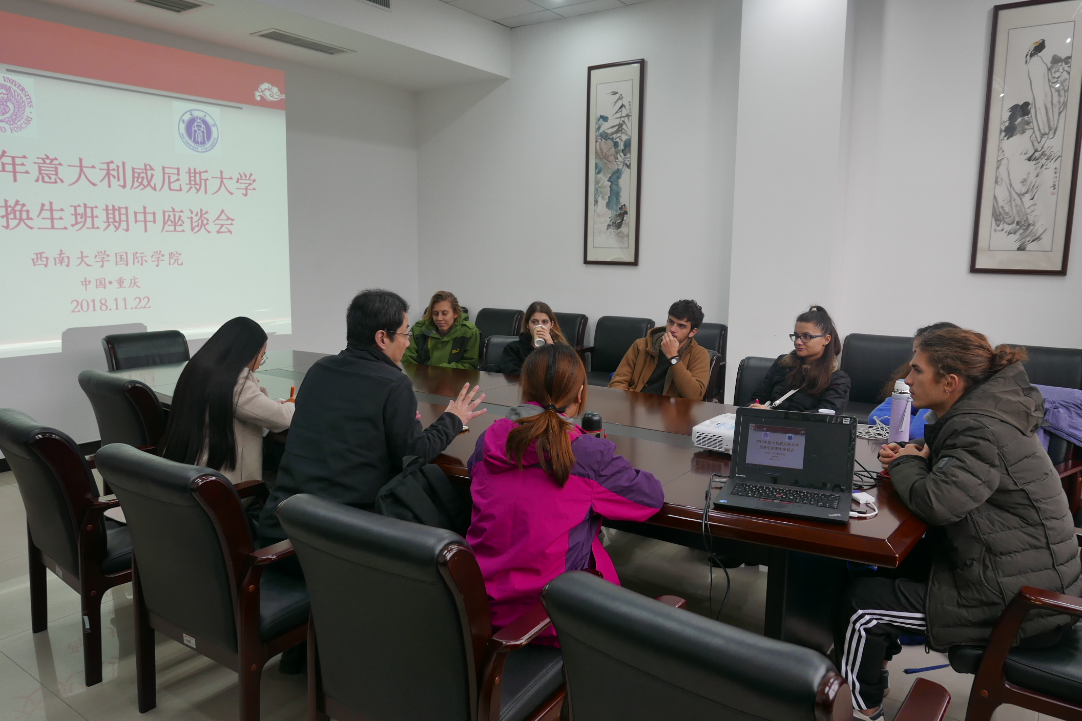 11月22日下午,意大利威尼斯大学交换生班期中座谈会在suncitygroup太阳集团紫云楼304会议室举行。副经理李航,教师代表王菁,以及2018年意大利威尼斯大学交换生班部分员工参加了本次座谈。会议由班主任刘妍芩主持。