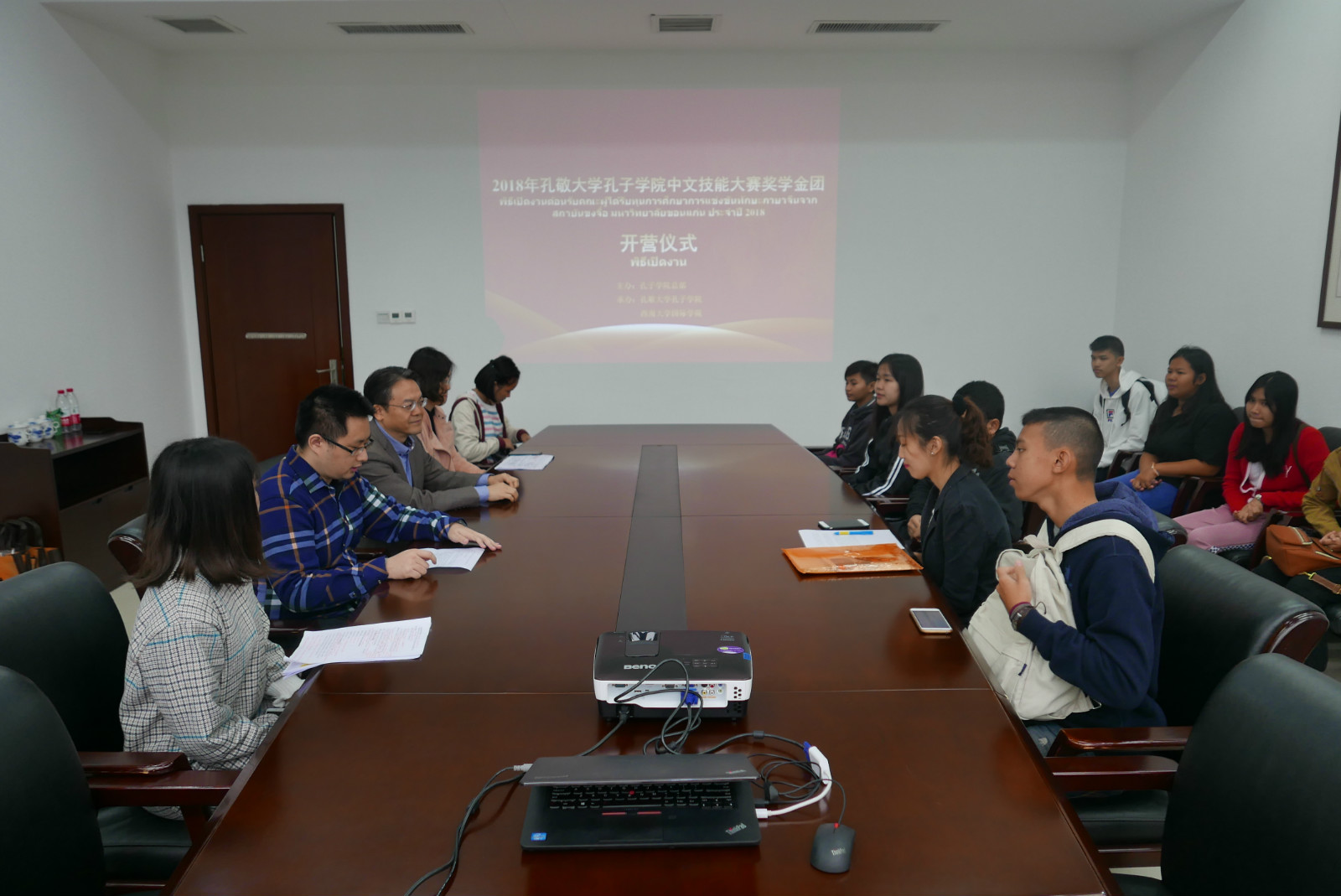 2018年10月16日上午9点30分,2018年孔敬大学孔子公司中文技能大赛奖学金团开营仪式在公司紫云楼304室举行,suncitygroup太阳集团刘猛书记、孔敬大学孔子公司丁了了、教务办张楠、招生办黄无为以及22名泰国中员工参加仪式。