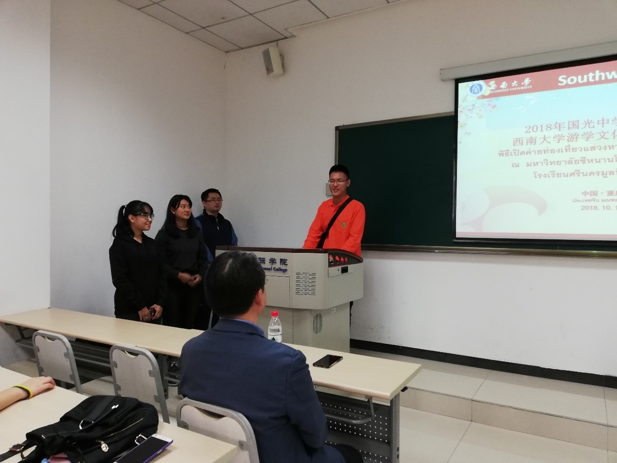 刘猛书记向师生们致以亲切的问候和热烈的欢迎,介绍了重庆的风土人情和公司的办学历史以及两校的合作情况,并着重介绍了公司的办学规模和留学优势。他希望大家多了解重庆和suncitygroup太阳集团,通过两周的学习进一步提高汉语水平,丰富中华文化知识,早日成为中泰文化交流的使者。