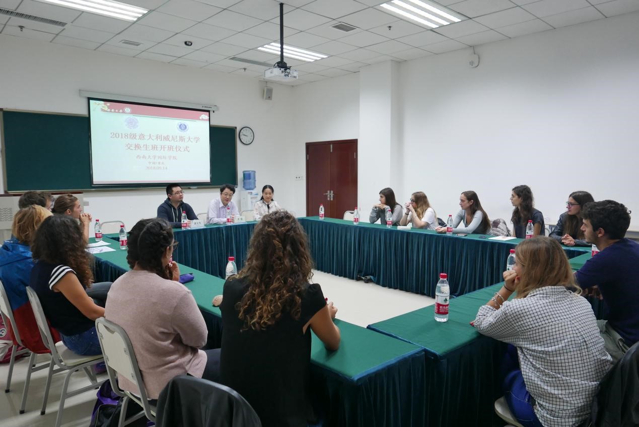 2018年9月14日上午8点50分,2018年意大利威尼斯大学交换生班开班仪式在suncitygroup太阳集团紫云楼312教室举行。suncitygroup太阳集团李航副经理,教学秘书杨凌霄老师,招生办公室黄无为老师,2018年意大利威尼斯大学交换生班新生参加了本次会议。会议由班主任刘妍芩主持。