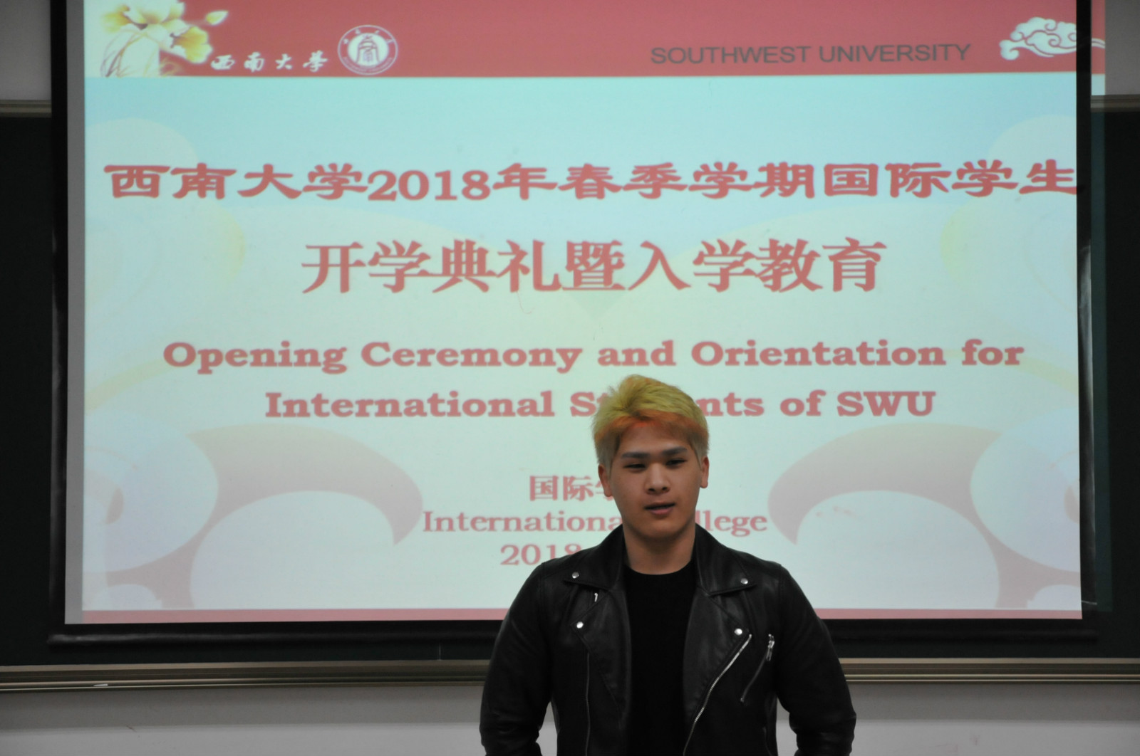刘猛书记致辞。他热情欢迎大家来到美丽的校园,并介绍了集团独特的自然环境与人文资源及公司来华留学教育概况。他以“今天我以西大为荣,明天西大以我为骄傲”与新生共勉。
