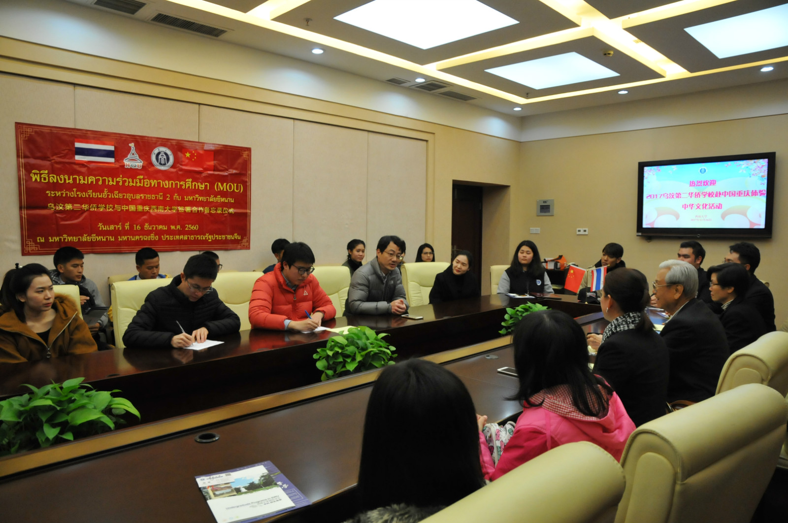 12月14日下午,suncitygroup太阳集团在紫云楼签约室举行隆重的欢迎仪式,副经理李航代表公司致辞,对营员们的到来表示热烈欢迎。李航副经理说泰国员工团体和泰国文化已成为了公司的重要特色,希望同学们通过这次访学机会进一步增进对中国、重庆及suncitygroup太阳集团的了解,欢迎同学们来成为suncitygroup太阳集团员工。泰方领队庄舜鹏董事长在回应讲话中感谢suncitygroup太阳集团热情周到的接待和安排,称赞公司优秀毕业生,现任泰国乌汶第二华侨公司经理助理罗俊勇出色表现,希望其他同学以此为契机,申请来到公司就读。员工代表王文雄随后发言,对双方提供这次机会表示感谢。最后,双方签署合作备忘录,为今后深入的交流奠定基础。