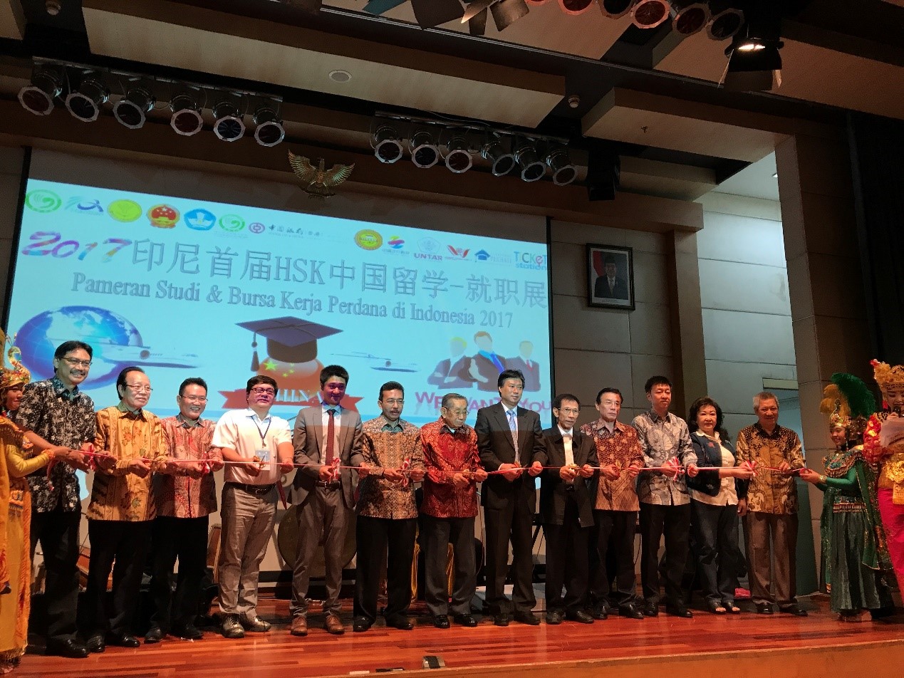 10月29日上午,展会开幕式在公司伙伴公司、印尼4000多所高等院校中排名前九的达国大学隆重举行。印尼文化与教育部培训与辅导司司长尤素夫、中国驻印尼大使馆文化参赞周斌、雅加达华文教育协调机构总主席郑年锦、常务副主席颜培春、执行主席蔡昌杰、雅加达达国大学基金会主席Gunardi等嘉宾出席开幕式。尤素夫司长对首届HSK留学就职展的举办表示祝贺,他指出,当前印中两国各领域合作发展良好,该展会的举办不仅促进两国文化教育交流,还增加了就业渠道,对印尼当前700万失业率的社会现状将起到积极的改善作用。周斌参赞表示,首届HSK留学就职展为印尼员工提供了丰富的留学与工作机会,为印尼教育机构和教育界人士和普通民众了解中国教育和高校发展情况提供更多信息,为印尼员工搭建起了留学中国、了解中国的桥梁。