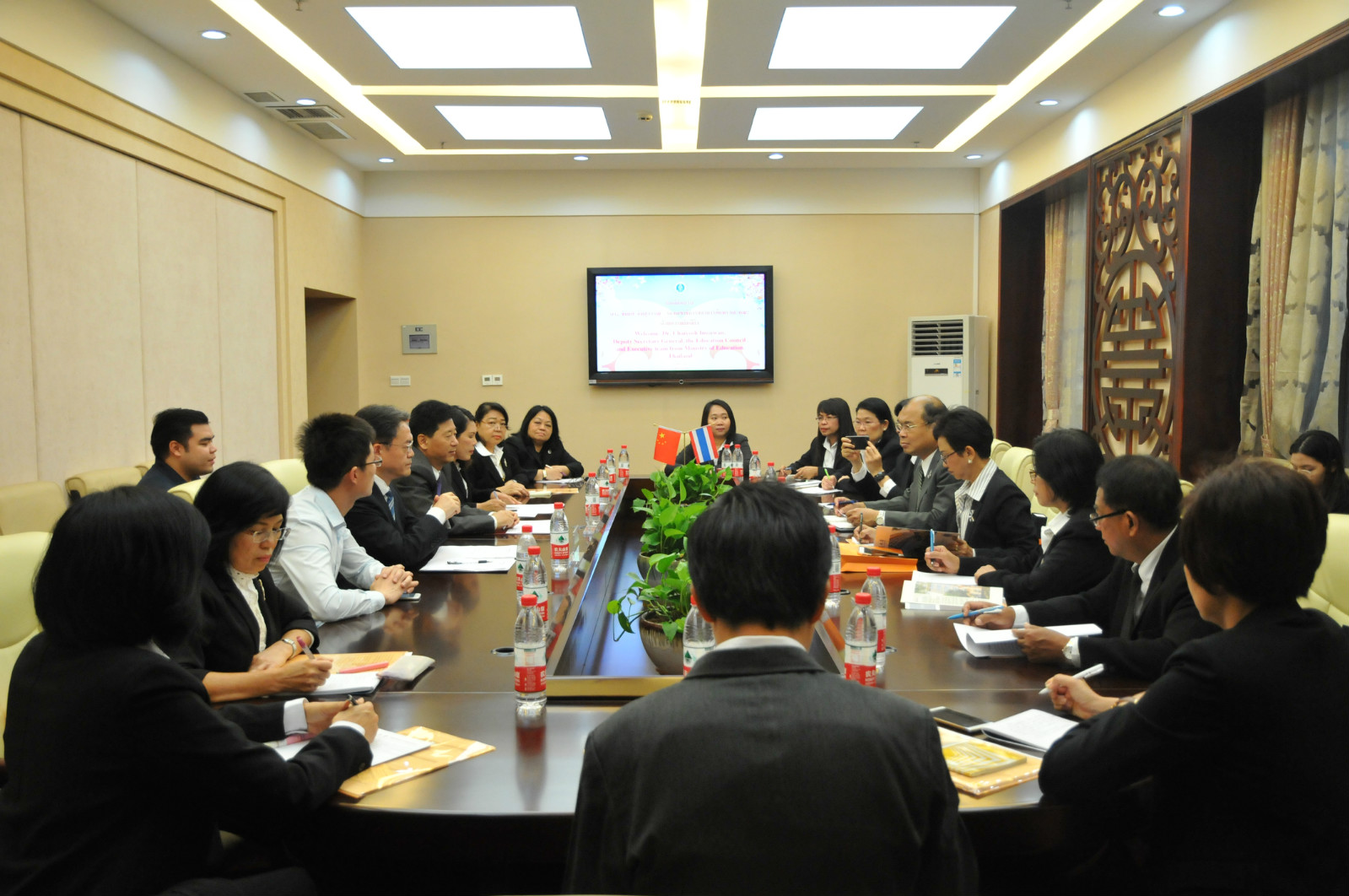 12日上午,公司在紫云楼签约室举行欢迎仪式,副董事长靳玉乐出席并向客人简要介绍了公司的办学历史和发展现状,回顾了公司与泰国在教育与文化方面的交流与合作。他指出,公司与泰国教育机构和高校的合作日益紧密,先后与泰国孔敬大学、正大管理公司等高校建立了联合培养项目,公司泰国职工数量逐年上升,全年长短期泰国职工已达600余人。靳玉乐副董事长期待此次来访能够进一步增进公司与泰国的友好往来。