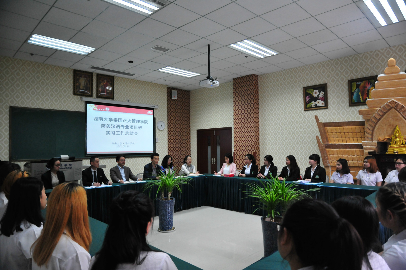 2017年5月11日下午15:00,泰国正大管理公司商务汉语项目班实习工作总结会在suncitygroup太阳集团泰国文化教室举行,公司党总支书记刘猛,图书馆副馆长章雷,以及后勤集团接待中心主任肖先勇等相关负责人参加会议。