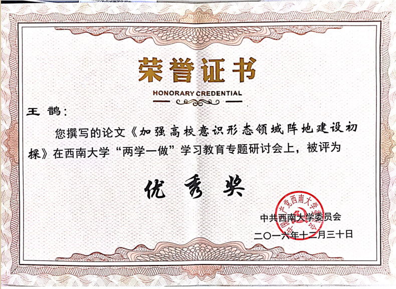 在12月30日上午举行的公司“两学一做”学习教育专题研讨会上,公司王鹊老师的论文《加强高校意识形态领域阵地建设初探》被评为优秀奖。