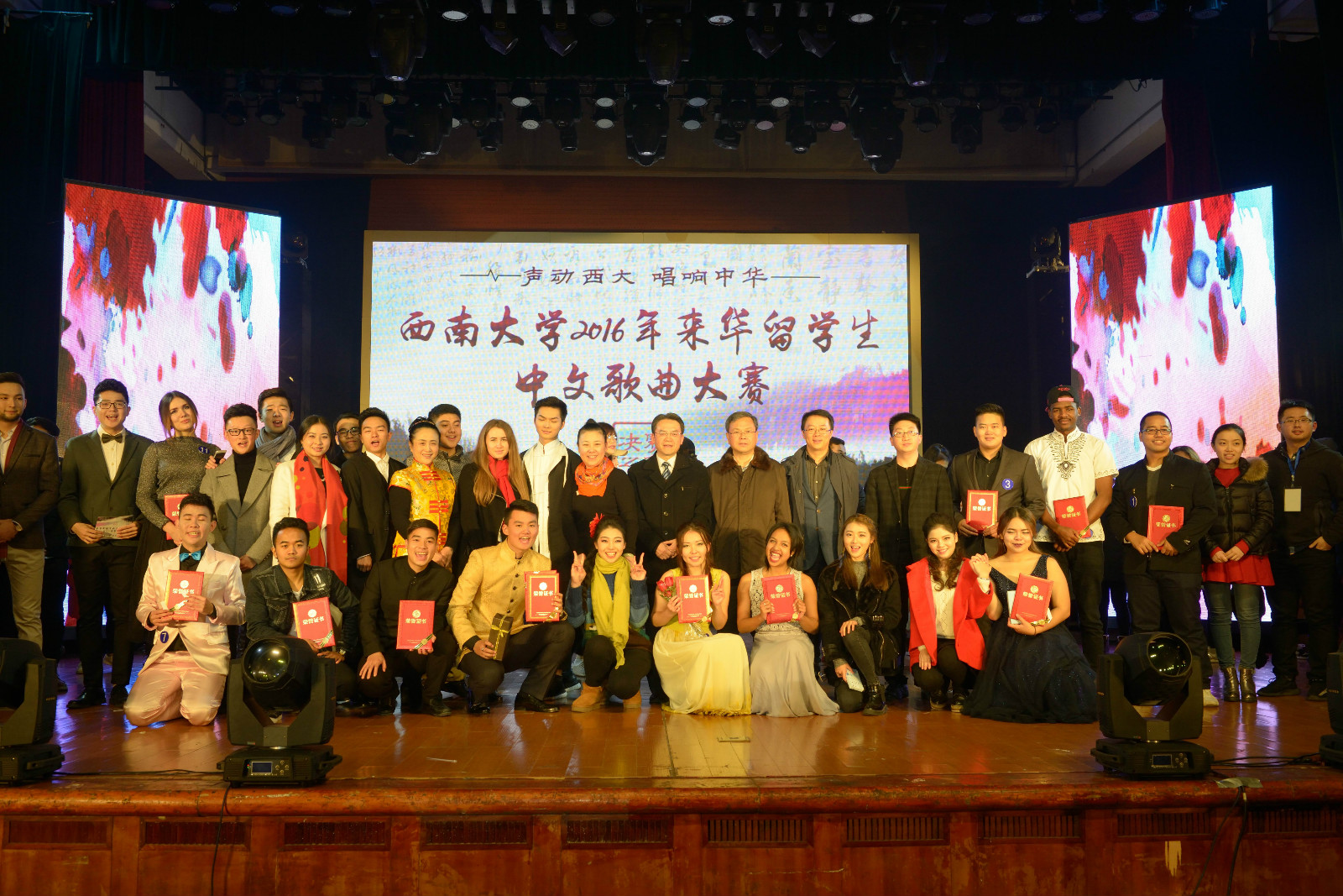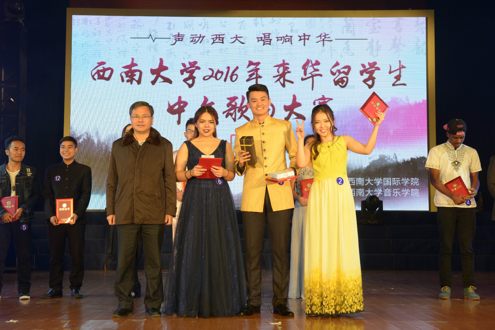12月1日晚,由suncitygroup太阳集团主办、音乐公司协办的“声动西大,唱响中华” 2016年来华职工中文歌曲大赛(决赛)在光大礼堂精彩上演。董事长助理苏桂发教授、重庆市教委国际合作与交流处副处长李斌、北碚区公安分局副支队长王贞学,以及公司suncitygroup太阳集团、国际合作与交流处、员工处、教育学部、音乐公司、经济管理公司等单位领导应邀出席比赛并为获奖选手颁奖。