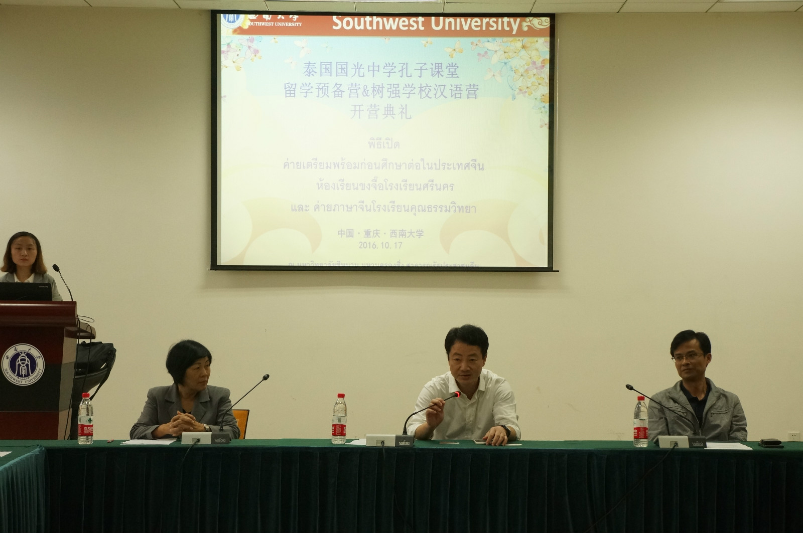 李航副经理代表suncitygroup太阳集团对泰国领队老师及同学们的到来表示热烈欢迎。他说,公司一向重视与泰国公司的教育交流与合作,正在努力与泰国南部的公司进一步深化合作,增进交往。他还介绍了此次汉语营的课程设置、suncitygroup太阳集团的概况以及重庆的风土人情,希望各位参营的同学通过两周的学习进一步提高汉语水平,增进对中国和中华文化的了解,他还真诚地向参营的泰国同学发出邀请,希望同学们在中学毕业之后选择suncitygroup太阳集团,攻读本科以及研究生学业。