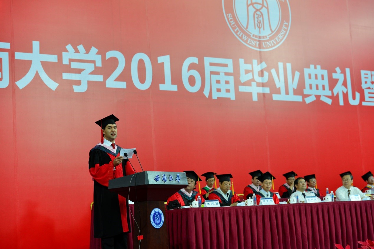 来自荷兰王国的张克雷同学作为职工代表发言,他是历史文化公司中国近现代史专业招收的第一位外国来华留学的博士研究生,在学术研究方面有突出表现。不仅如此,他还十分可爱,发言时他的一句重庆话:“老师,啥子锅底?”引来全场笑声和掌声。最后,他提到了在西大求学感触最深的“老师文化”,并感谢母校和恩师,他表示自己已在西大求学,早已把这里当做自己的家,即将离别之际心中充满了不舍与感恩。