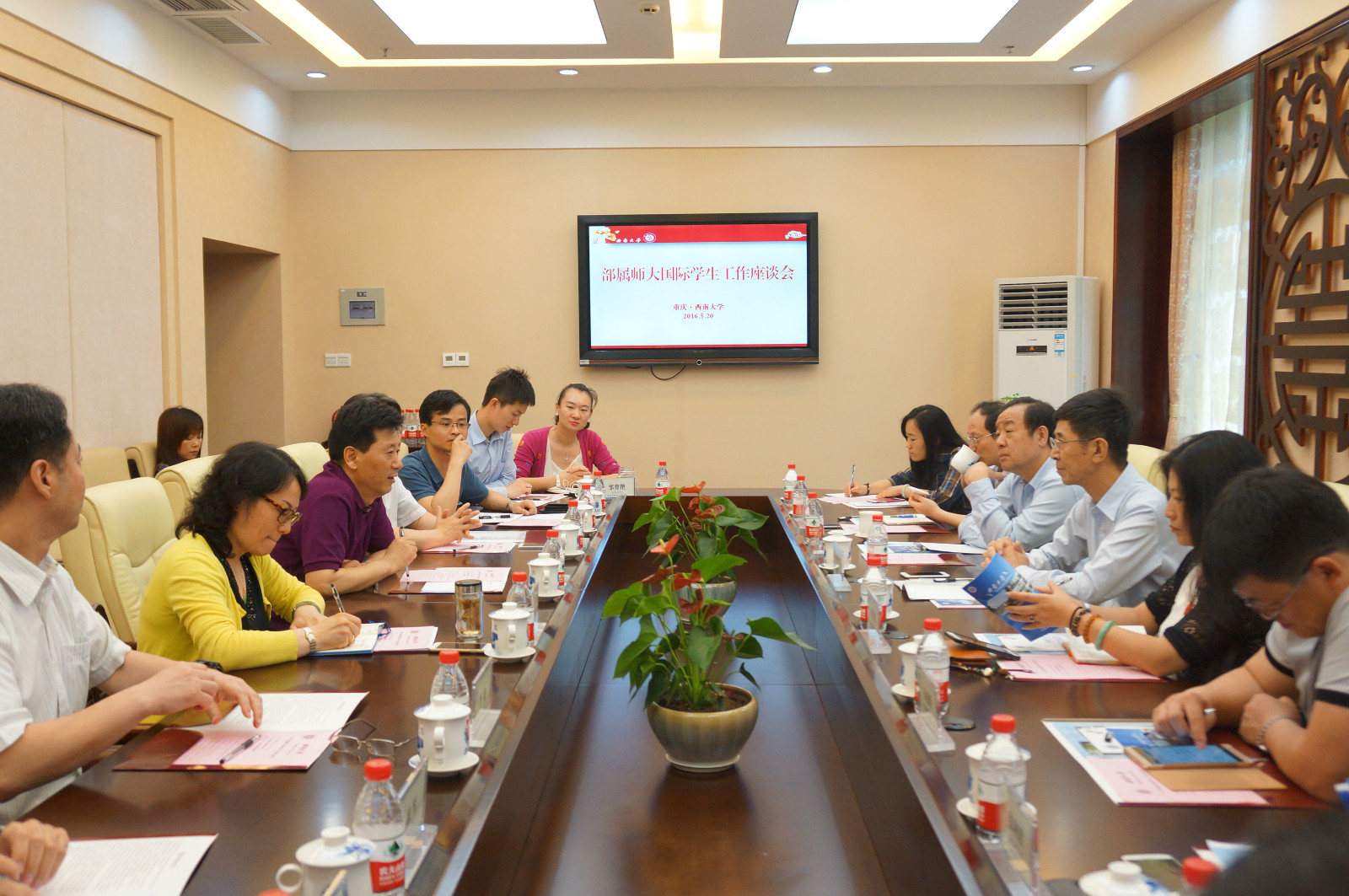 2016年5月20日下午,部属师大国际员工工作座谈会在公司suncitygroup太阳集团签约室举行。中国高教学会外国职工教育管理分会副会长兼秘书长贺向民,华东师范大学国际教育中心主任黄美旭,陕西师范大学国际汉公司经理张建成,北京师范大学国际合作与交流处副处长艾忻,东北师范大学国际合作与交流处副处长孙德胜,华中师范大学国际文化交流公司副经理周波,suncitygroup太阳集团副董事长靳玉乐,suncitygroup太阳集团经理王静、党总支书记刘猛、副经理李航参加了座谈会,会议由suncitygroup太阳集团经理王静主持。