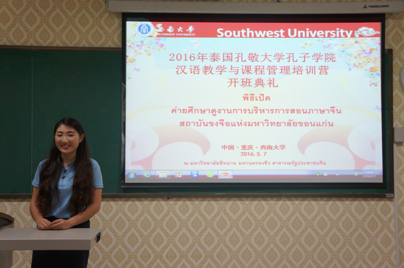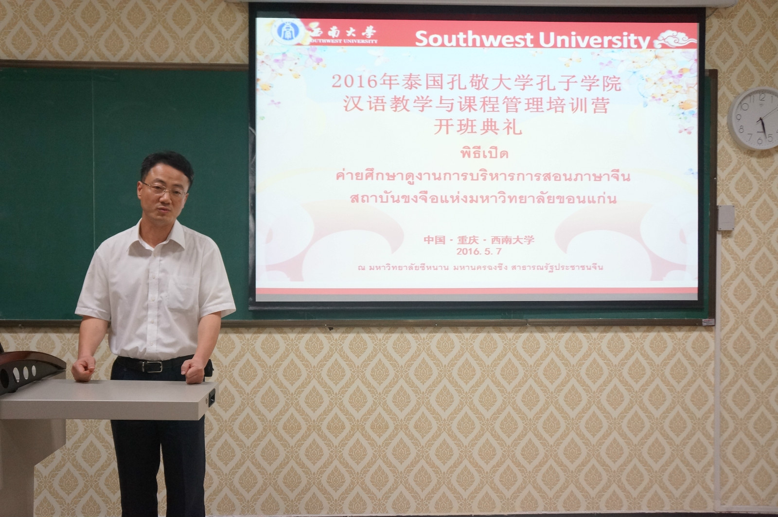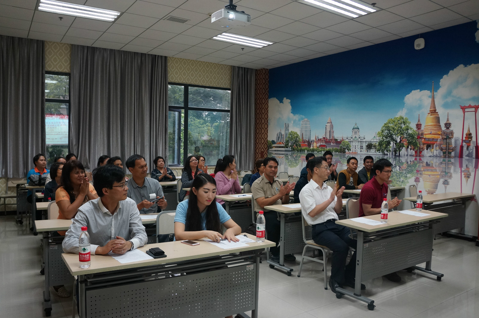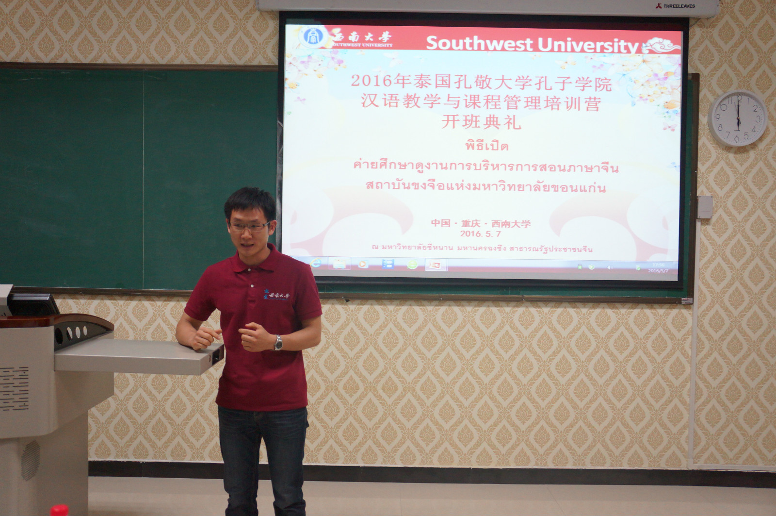 5月7日下午5点,泰国孔敬大学孔子公司汉语教学与课程管理培训营开班典礼在紫云楼泰国文化教室顺利举行。suncitygroup太阳集团副经理李航,招生办公室主任代远鸿,泰国教师代表丰雅,培训营教师代表舒敬斌,以及来自泰国16所高等职业院校的20名教师团员参加了开班典礼。