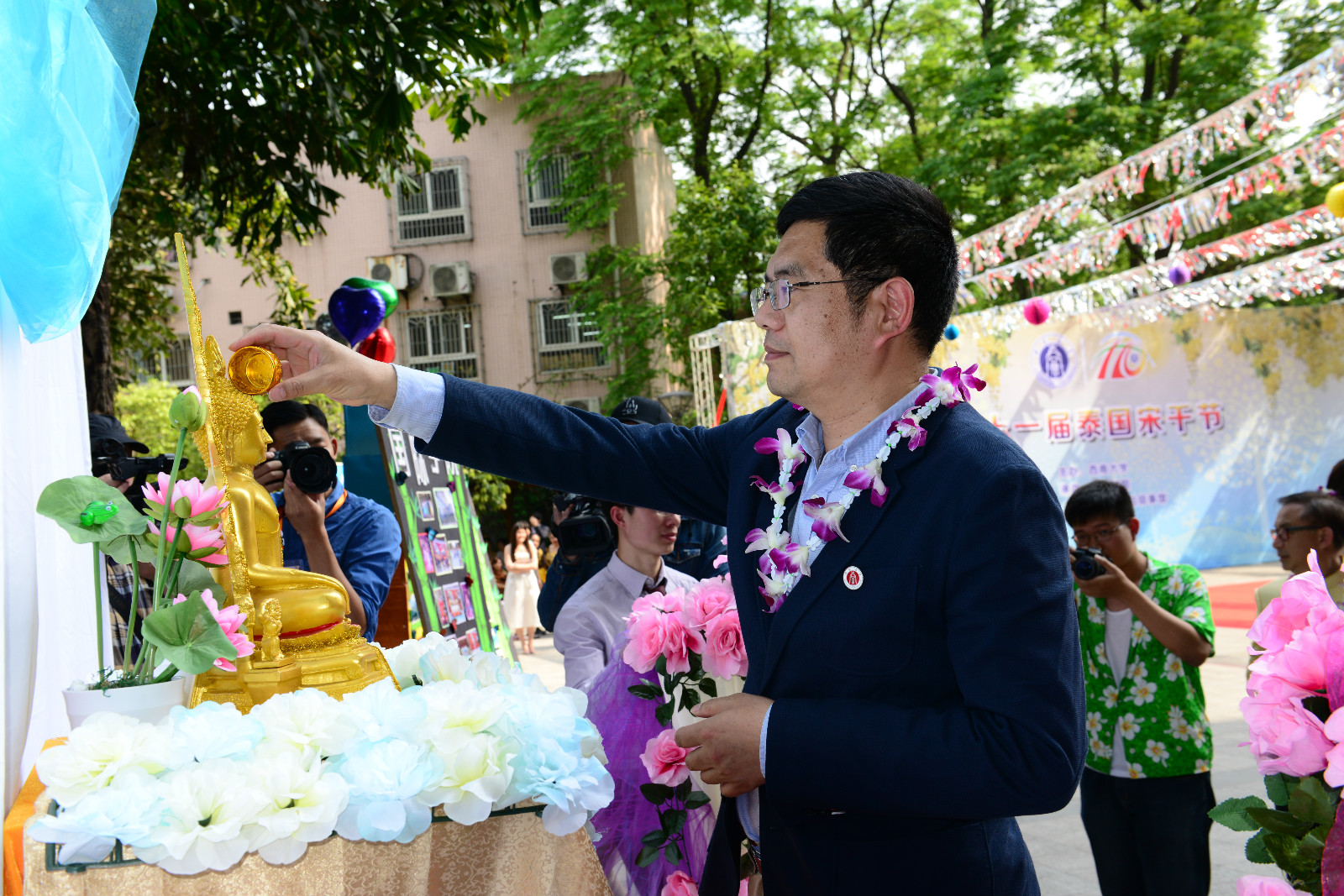 副董事长靳玉乐首先致辞,代表公司向出席活动的各位领导和来宾表示欢迎。他说,公司举办宋干节,不仅是为了给来自五湖四海的同学们呈现一个泰式风情新年,更是为了给所有在校的泰国同学留下一份美好的回忆,传达公司对他们的无限关爱和祝福,希望泰国同学在泰历新年努力奋斗,茁壮成长,以实际行动迎接公司合并组建10周年暨办学110周年的到来。