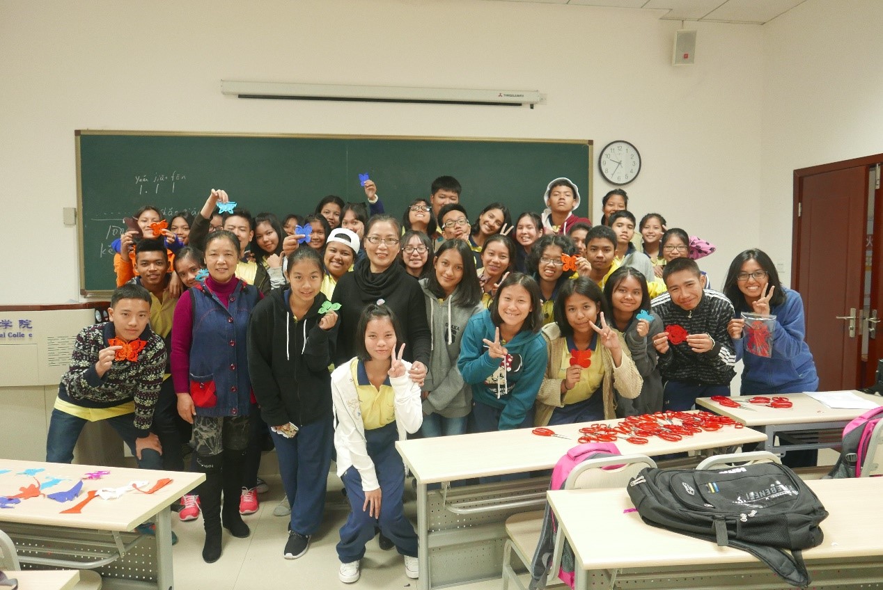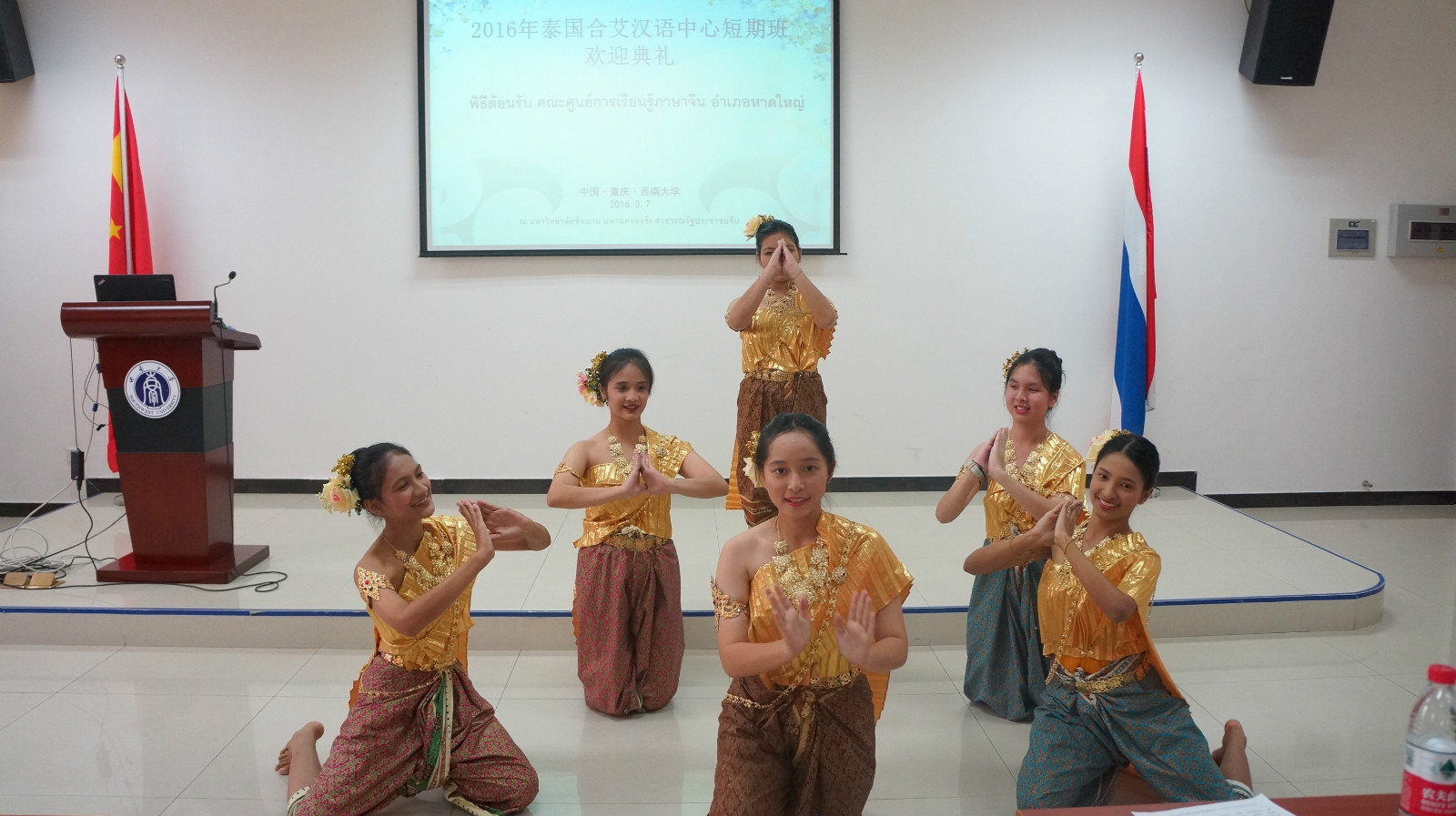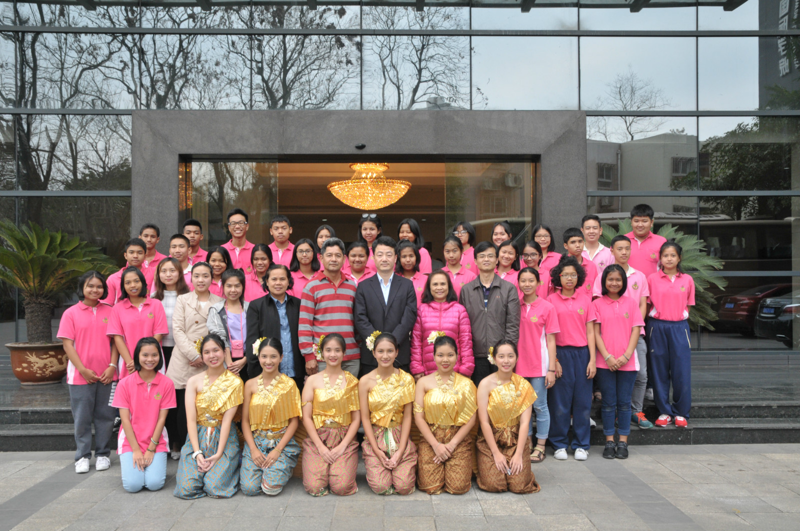 李航副经理向泰国教师代表赠送纪念品,6名泰国员工表演了泰国传统风情舞蹈,典礼在愉悦的氛围中结束。会后大家在紫云楼前合影留念,泰国团员们在语伴的陪同下乘观光车参观了校园。