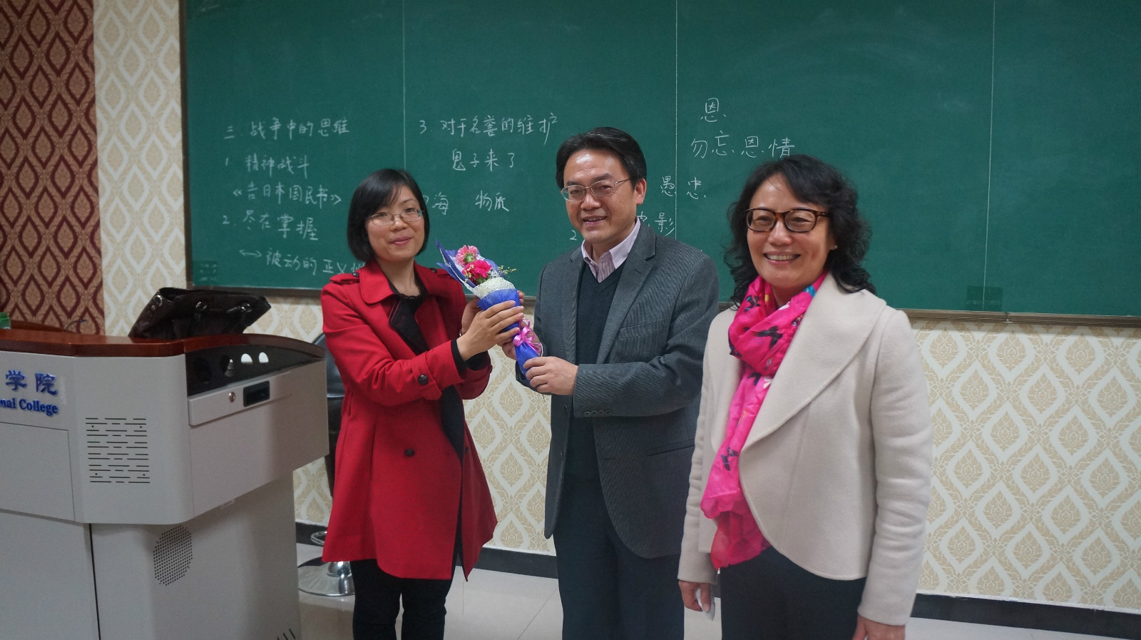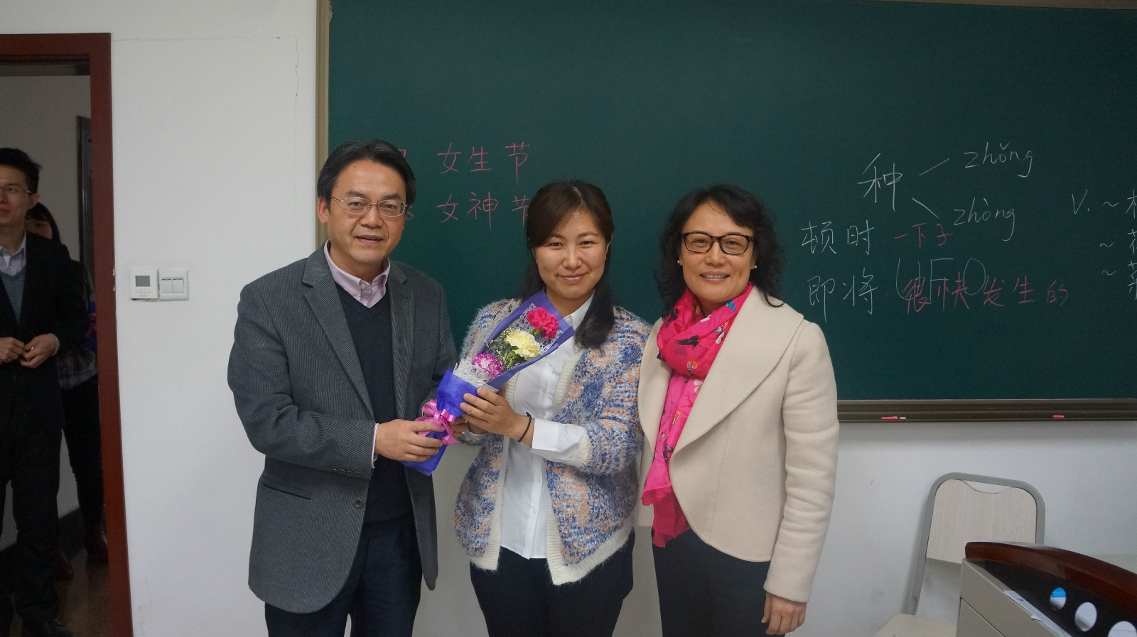 3月8日上午suncitygroup太阳集团紫云楼210教室内书声朗朗,讲台上,邱睿老师正在奋笔疾书。“不好意思,打扰一下”,教室门被有礼貌的敲开,让人意想不到的是,走进门口的是手捧鲜花的刘猛书记!