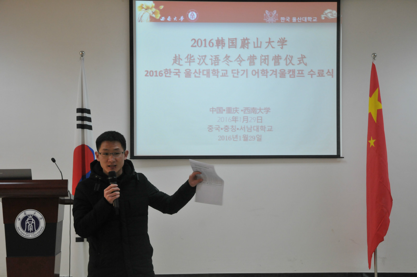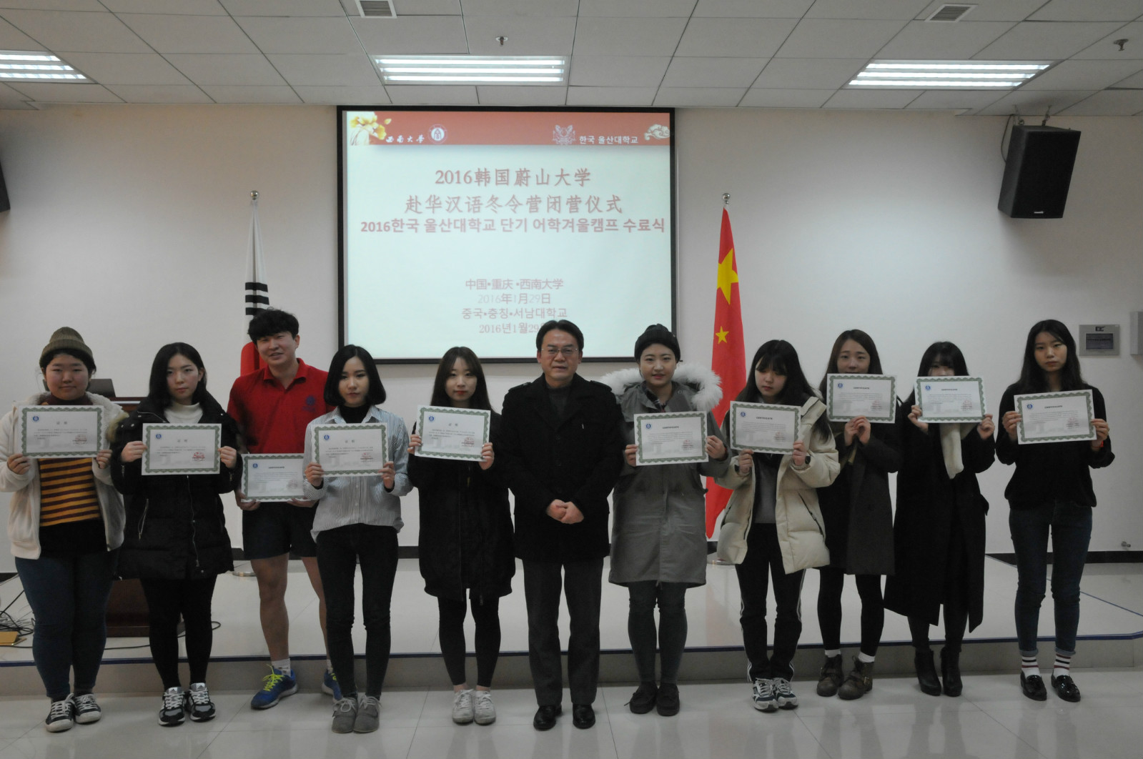 2016年1月29日,2016韩国蔚山大学来华汉语冬令营闭营仪式在紫云楼317室隆重举行,公司党总支书记兼副经理刘猛、招生办公室主任代远鸿、教师代表舒敬斌,以及国际志愿者代表和蔚山大学43名营员参加仪式。闭营仪式由王鹊主持。