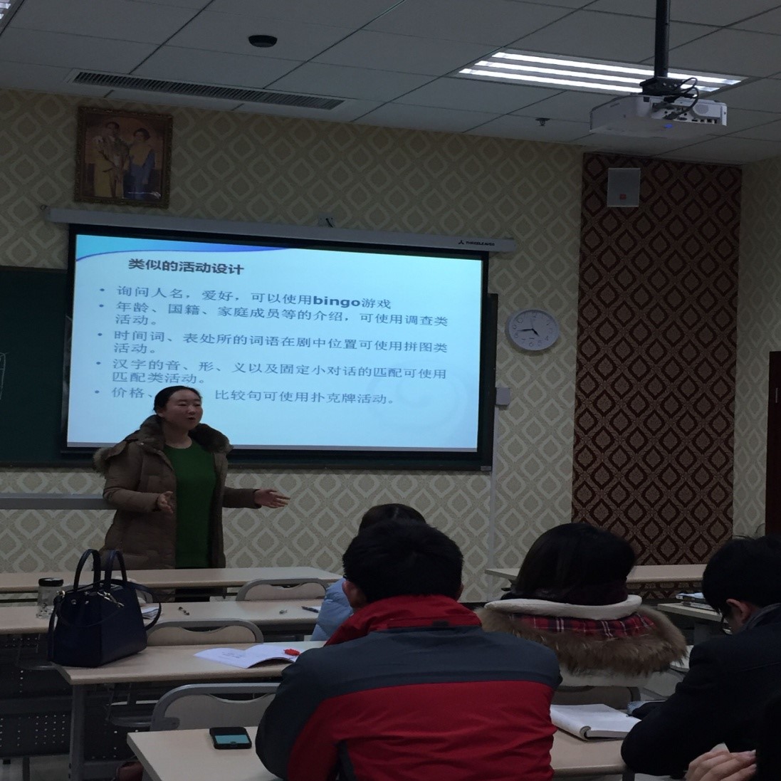 本次教研活动主要有两个中心内容。首先,范媛媛总结了目前初级汉语课堂在交际练习方面常见的现象,随后,根据这些现象提出了初级汉语课堂交际练习中出现的问题,比如:练习形式单一、交际性差、员工主动性不强、参与度不高等。然后,范媛媛针对这些问题,基于“记忆加工水平理论”、“任务型教学法”、“互动假说”,提出了“多人互动交际活动”的构想。通过课堂教学的实际案例,范媛媛向大家展示了该构想在教学中的应用。活动中,“多人互动交际活动”得到了老师们的一致好评,并且就该构思进行了深入的讨论。