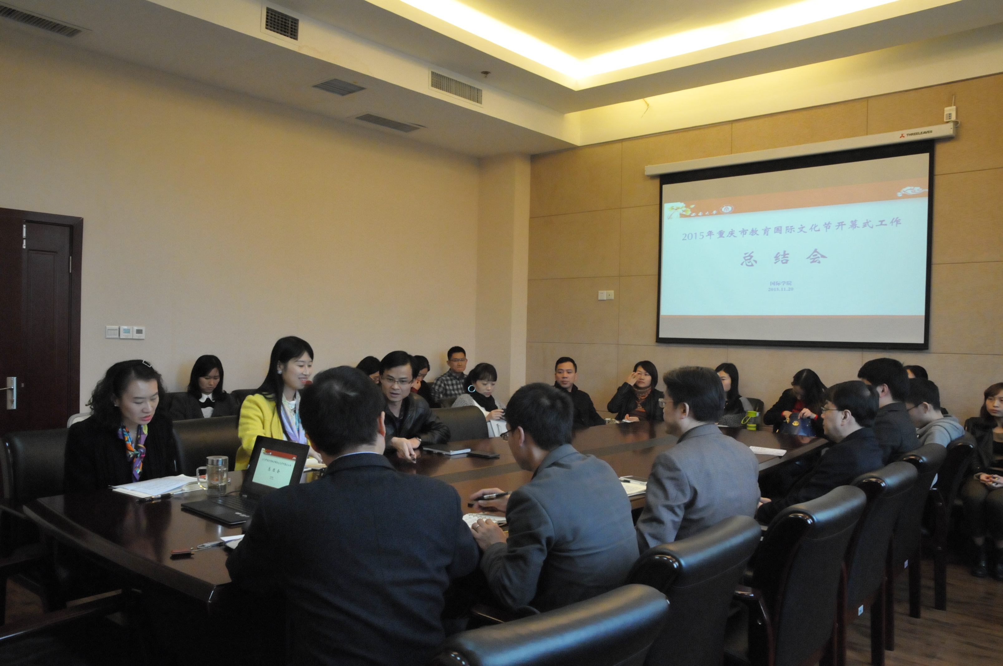 11月20日下午,2015年重庆市教育国际文化节开幕式工作总结会在紫云楼310会议室举行。经理张发钧、副经理张家政及suncitygroup太阳集团全体教职员工参加会议。会议由公司党总支书记兼副经理刘猛主持。