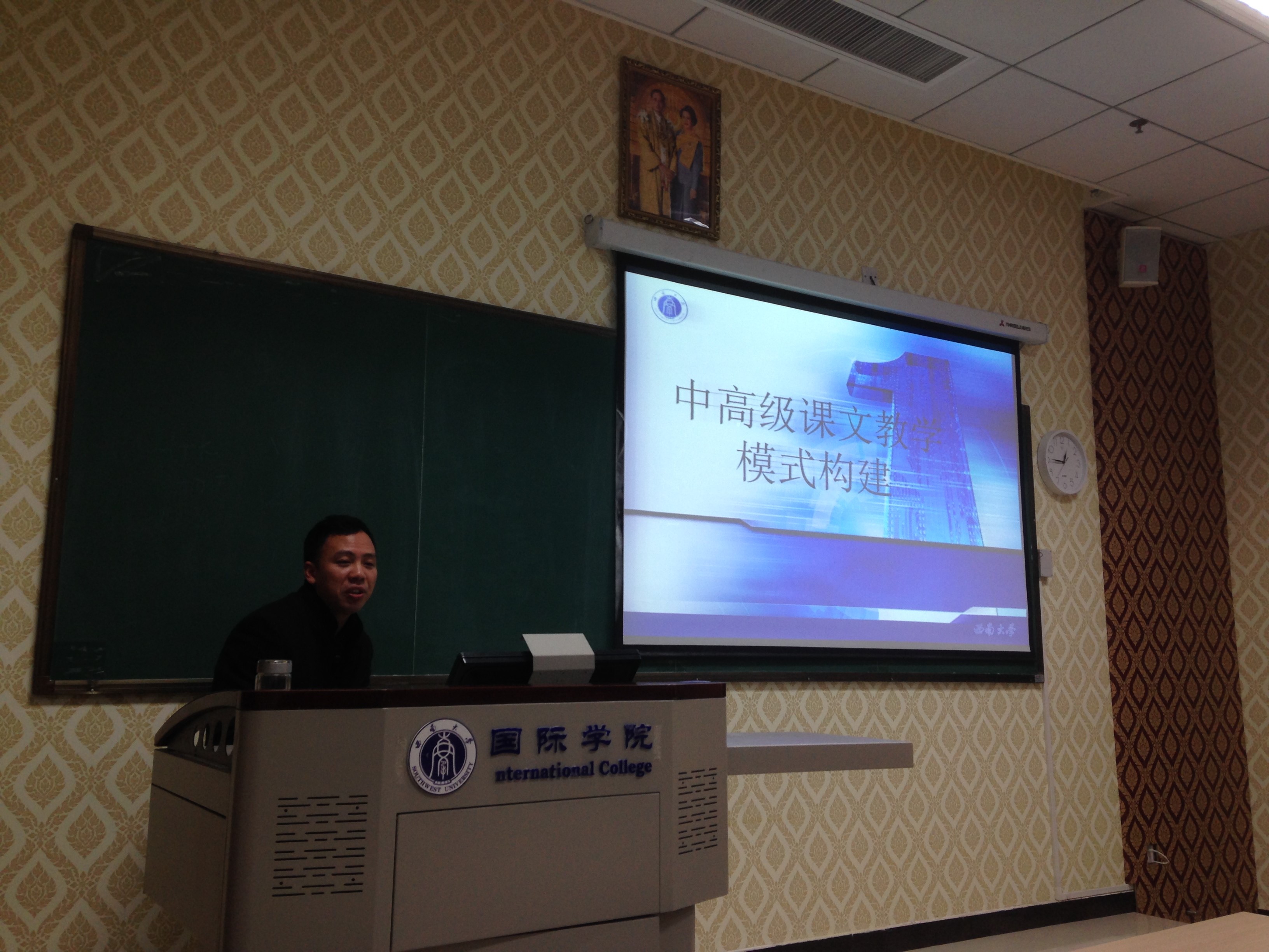 本次教研活动有两个议题。首先在汉语国际教育系主任耿军的带领下对现行使用的教材进行讨论和评价,为后续教学工作中教材的选用提供了第一线的真实信息。然后,耿军对中高级汉语综合课课文教学这一难点从心理学、二语习得理论等角度进行分析,进而提出了中高级课文的教学模式,并用课堂教学的实际案例为大家展示了该模式在教学中的应用。耿军的这一教学模式得到了老师们的一致好评,并且就这一问题进行了深入探讨。