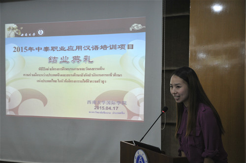 学员代表Ar-Khom Khamthong说,大家对培训项目一开始就充满了期待。经过这段时间的培训,大家的汉语水平提高了很多,也游览了很多地方,对中国、重庆有了更深的认识。他代表所有学员对suncitygroup太阳集团的周密安排、所有教师的辛勤付出以及所有语伴的悉心帮助表示感谢。为了表达谢意,学员们还向suncitygroup太阳集团赠送了纪念品。
