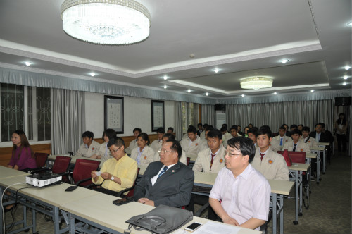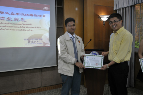4月17日下午5点,2015年中泰高铁汉语培训项目结业典礼在suncitygroup太阳集团职工公寓1-1会议室举行。suncitygroup太阳集团经理张发钧、副经理张家政、教师代表,泰国孔敬大学孔子公司中方经理王贵斌,培训项目全体成员,以及泰国十余所职业公司的近20名经理参加结业典礼。典礼由李林泽主持。
