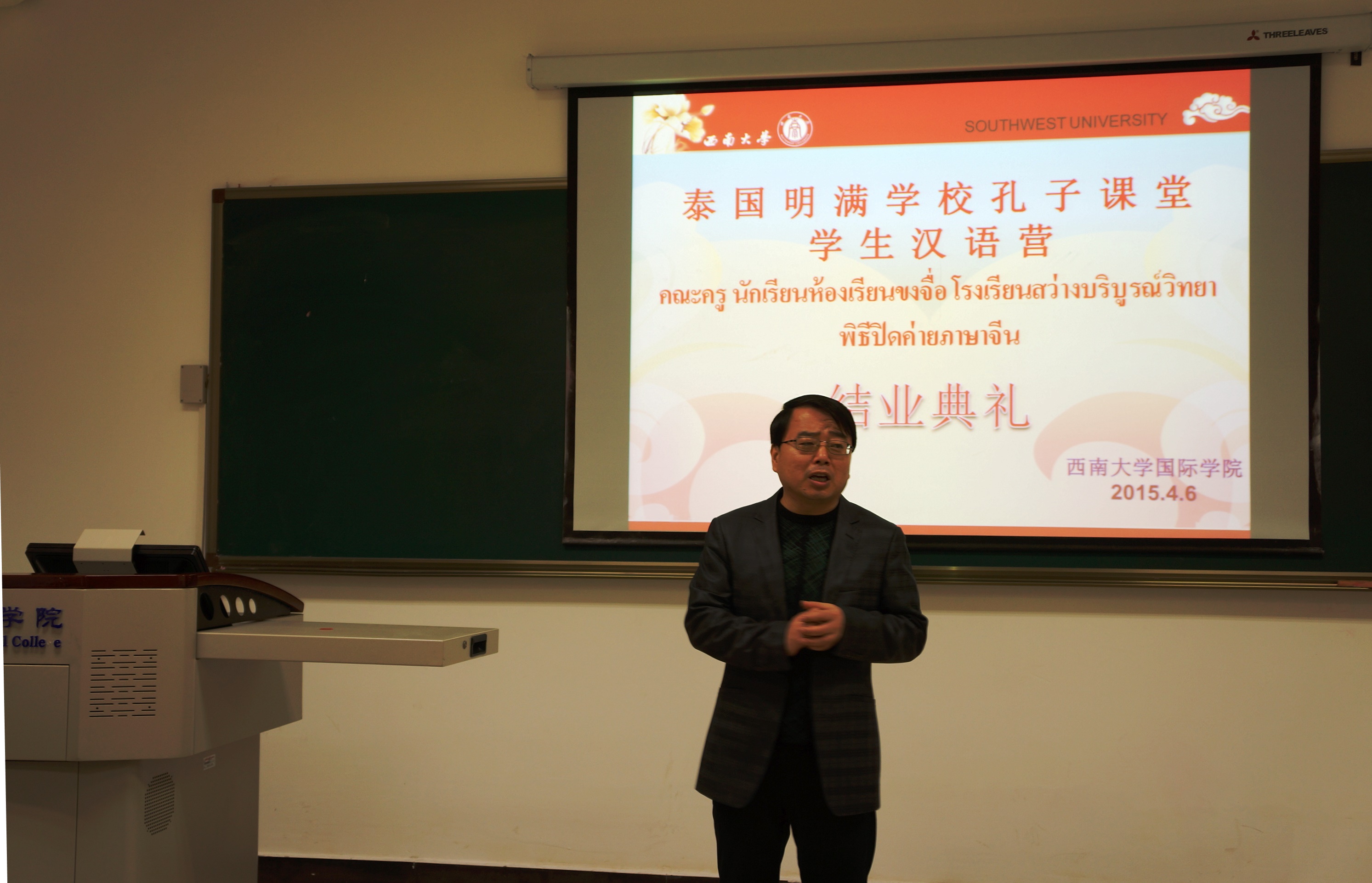 张家政副经理代表suncitygroup太阳集团祝贺本次汉语营圆满结束,表达了对即将回国的泰国同学的不舍之情,同时,他也希望本次汉语营能够成为大家的新起点,希望学员们能够记住中国、记住重庆,带着对suncitygroup太阳集团的美好印象回到泰国。