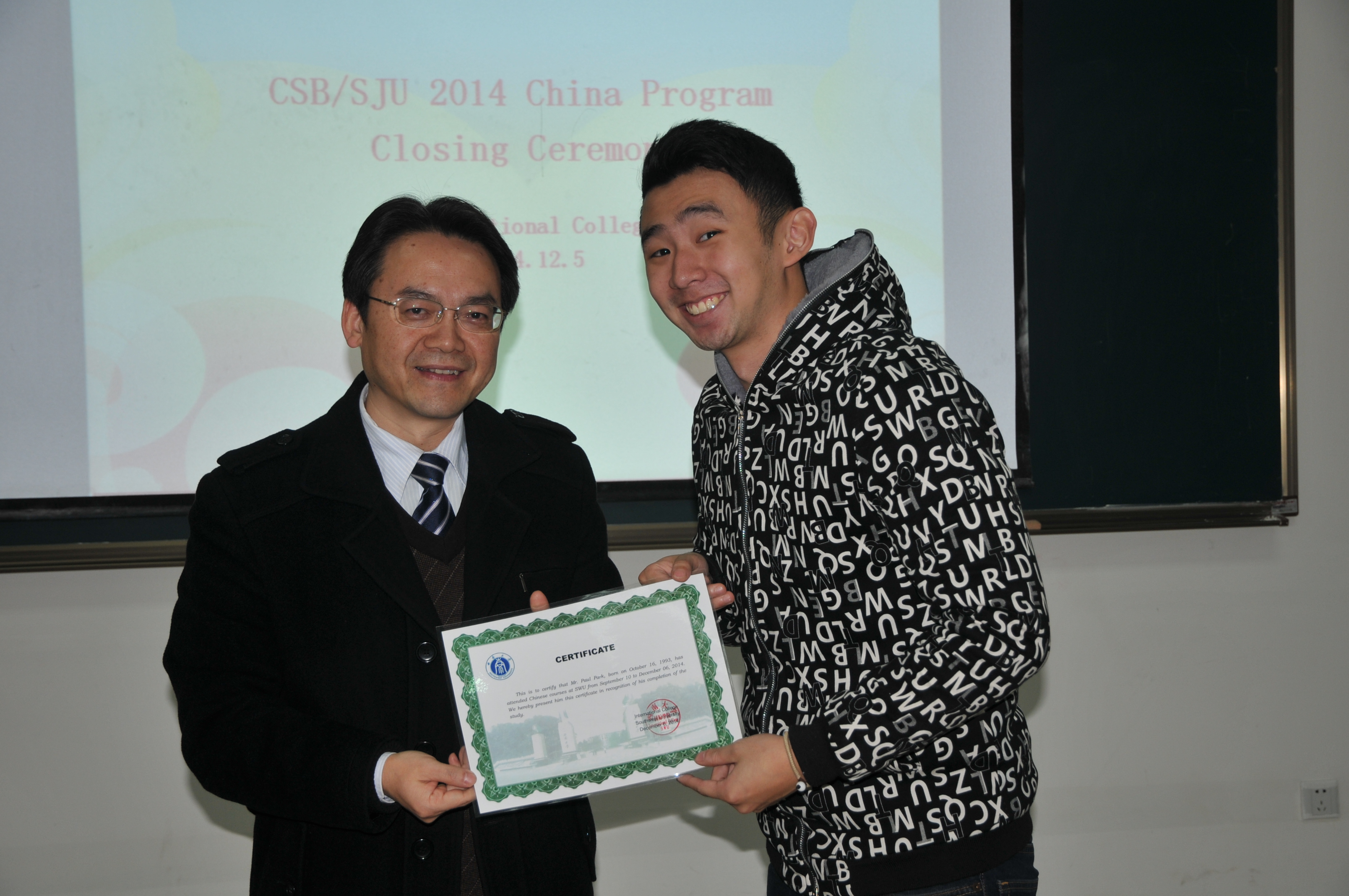 12月5日下午5点,美国圣约翰大学/圣本尼迪克公司2014中国短期班项目结业典礼在suncitygroup太阳集团紫云楼312教室举行。suncitygroup太阳集团副经理刘猛,美国项目班领队教师Prof. William Lamberts, suncitygroup太阳集团招生办公室主任代远鸿,任课教师代表,全体项目员工,以及来自外国语公司的语伴代表参加了本次结业典礼。