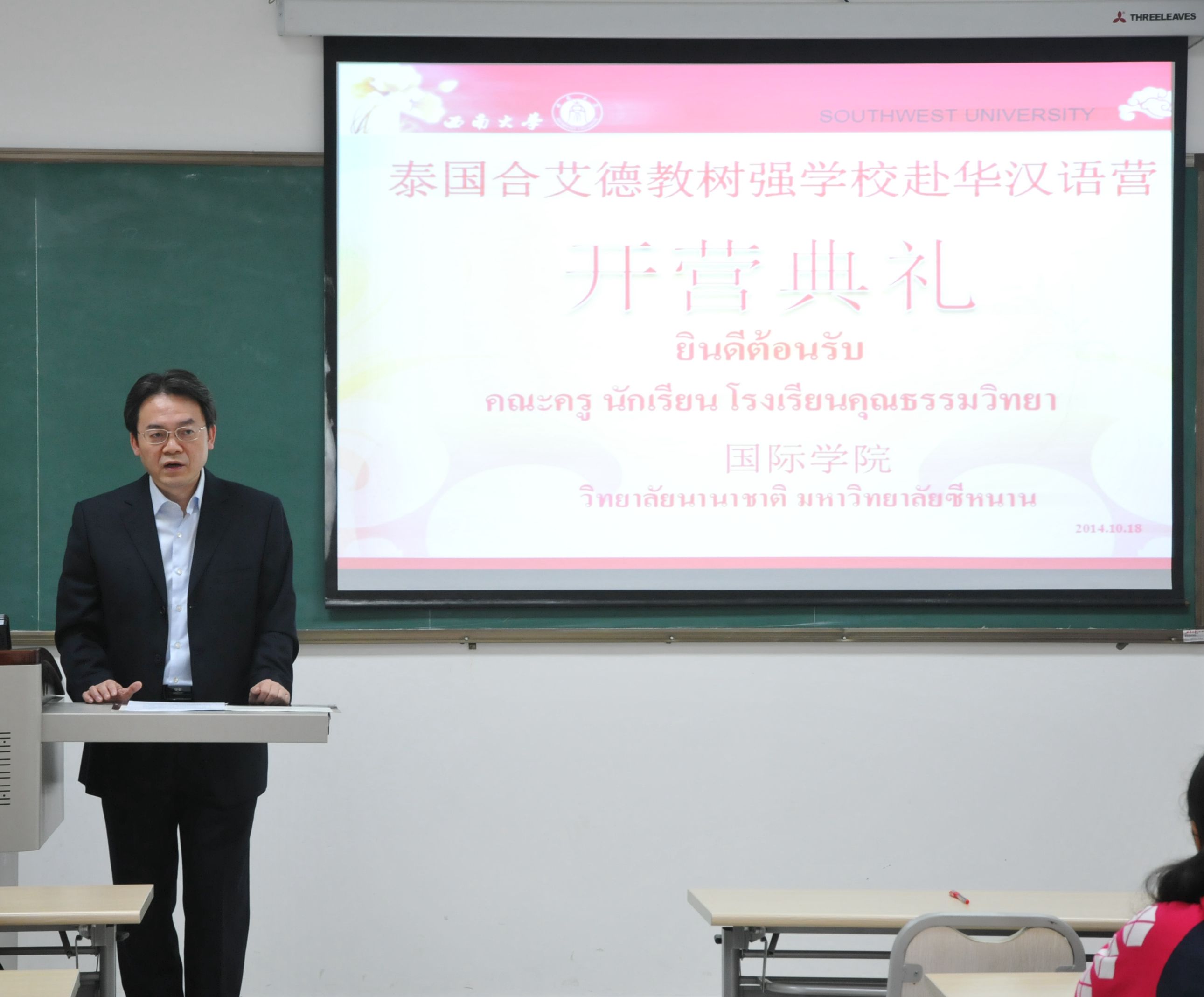 刘猛书记致欢迎辞。他介绍了重庆的概况和suncitygroup太阳集团的校园环境、办学特色和优势学科。指出公司历来重视国际合作与交流,职工数量逐年增加,培养质量不断提高。他希望泰国师生认真学习汉语,用心体验中国文化,为增进中泰友谊多做贡献。