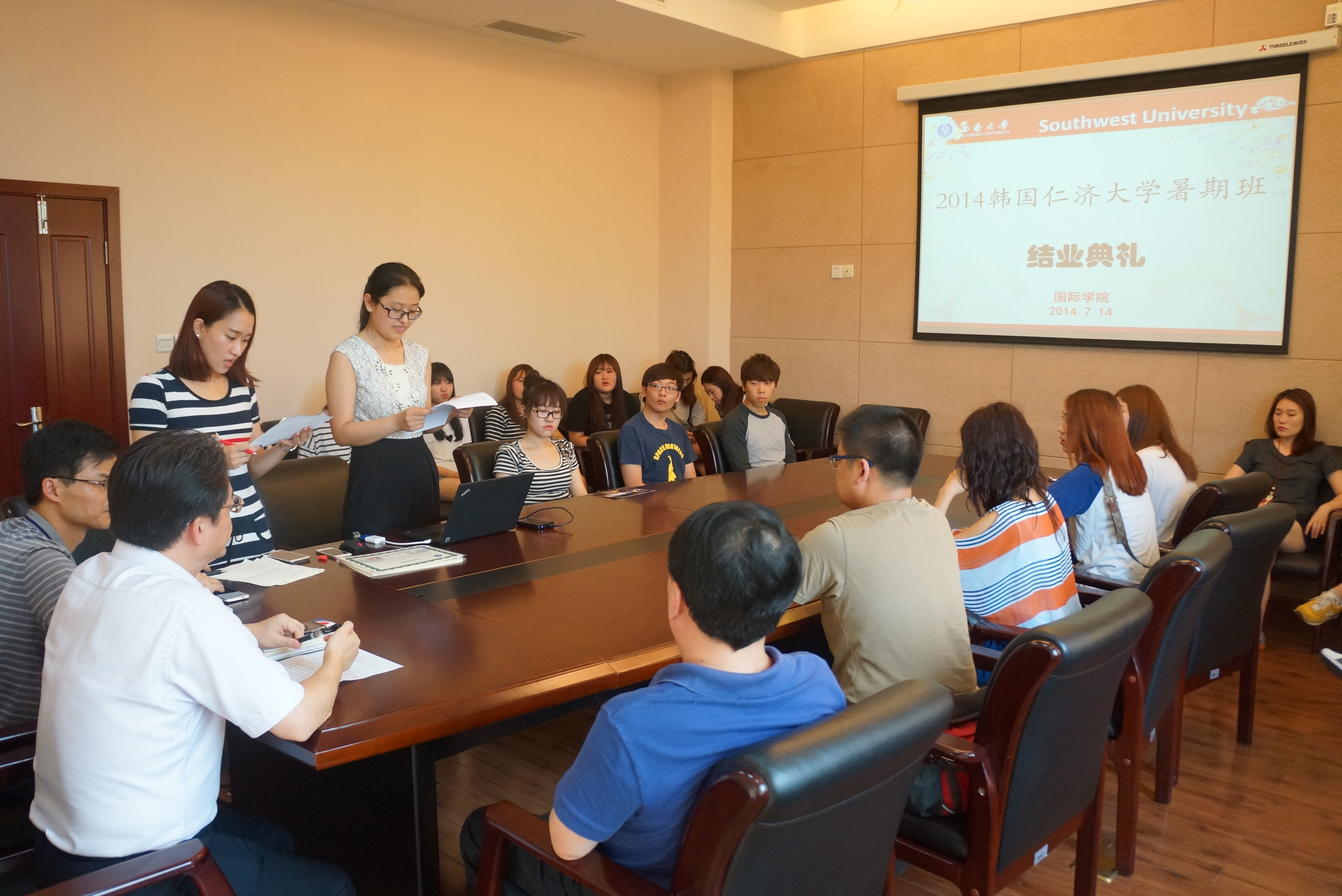 7月14日下午,2014年韩国仁济大学暑期班结业典礼在suncitygroup太阳集团310会议室隆重召开。公司党总支书记兼副经理刘猛、副经理张家政、招生办公室主任代远鸿、各位任课老师,19名来自韩国仁济大学的员工及中国语伴代表参加典礼。
