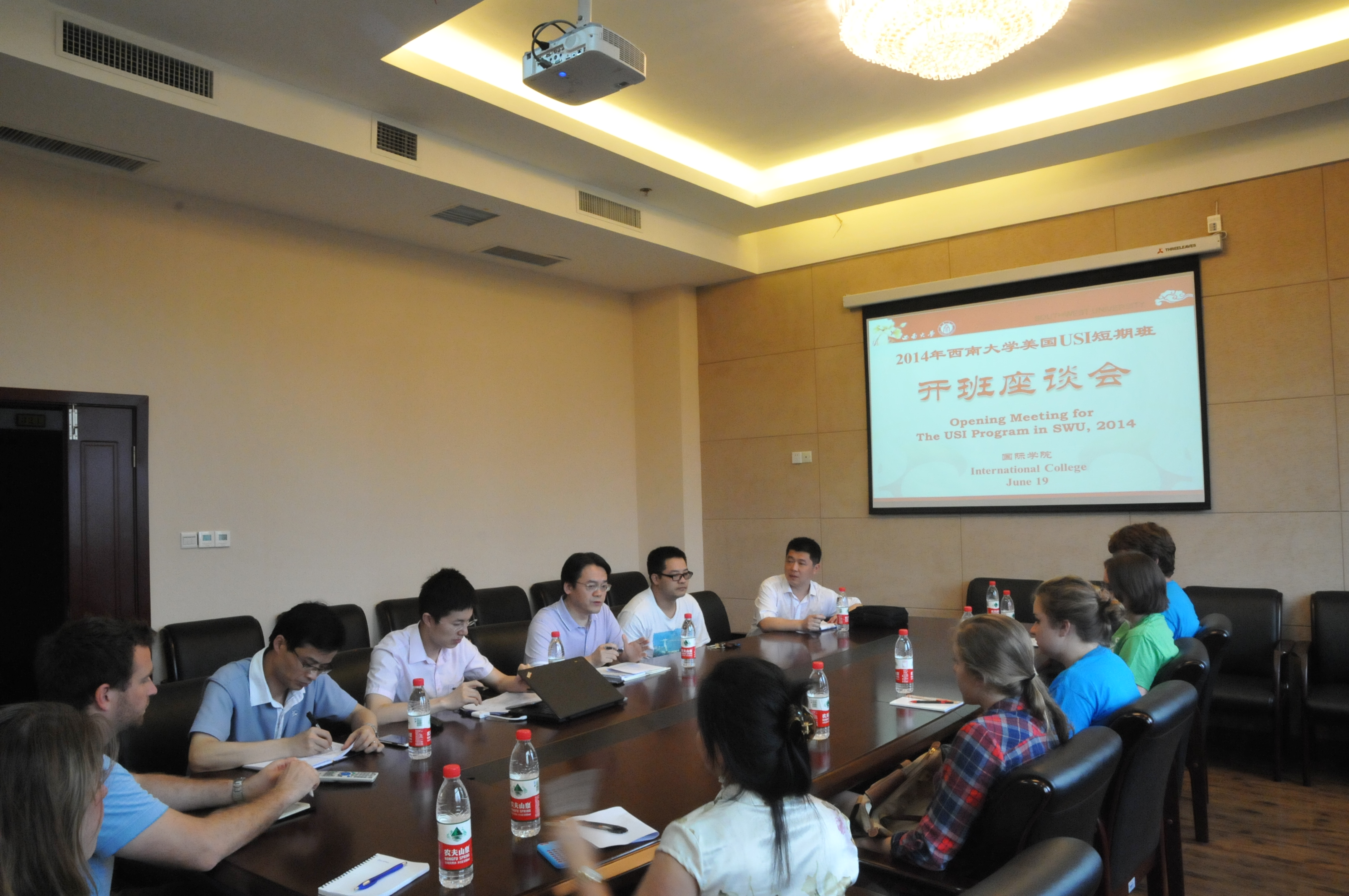 6月19日,suncitygroup太阳集团在紫云楼310会议室举行了简朴热烈的美国南印第安纳大学(USI)暑期项目开班仪式。副经理刘猛,招生办主任代远鸿、教师代表王勇、黎力, USI项目带队老师庞琳以及全体职工、中国语伴志愿者参加了开班仪式,仪式由该班班主任李林泽主持。