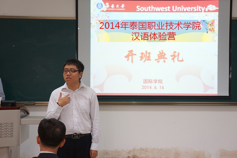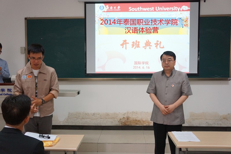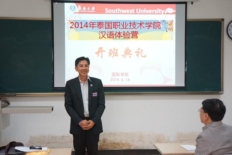 2014年6月16日上午18:00在suncitygroup太阳集团紫云楼312教室隆重举行了2014年泰国职业技术公司汉语体验营开营典礼。出席开营典礼的有suncitygroup太阳集团副经理张家政、招生办公室主任代远鸿、公司办公室主任邹育艳,公司教师代表徐心三老师,以及汉语体验营的23名学员和3名泰方教师。