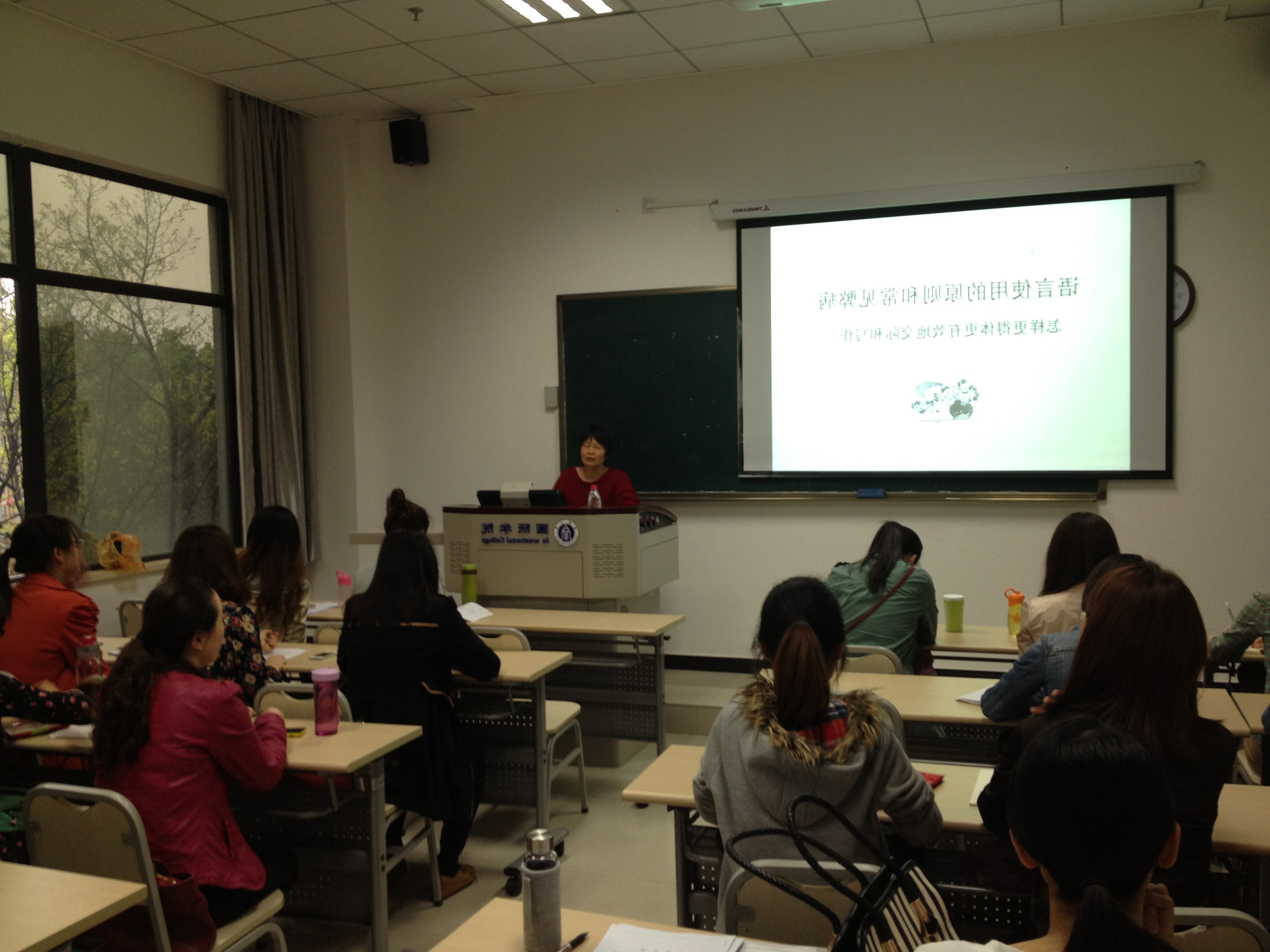 2014年4月28日上午九点半,suncitygroup太阳集团紫云楼216教室,suncitygroup太阳集团汉语言文献研究所李海霞教授为2013级汉语国际教育硕士研究生做了题为“语言使用的原则和常见弊病”的学术讲座。