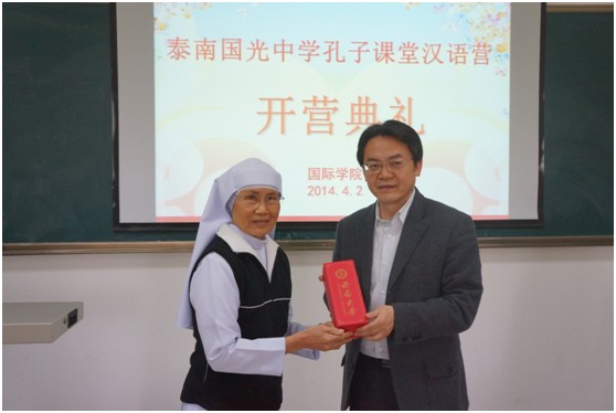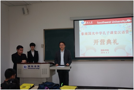 2014年4月2日上午9:00在suncitygroup太阳集团紫云楼312教室隆重举行了2014年泰南国光中学孔子课堂汉语春令营开营典礼。出席开营典礼的有suncitygroup太阳集团副经理刘猛、副经理张家政、招生办公室主任代远鸿、公司办公室主任邹育艳,以及汉语春令营的31名学员。