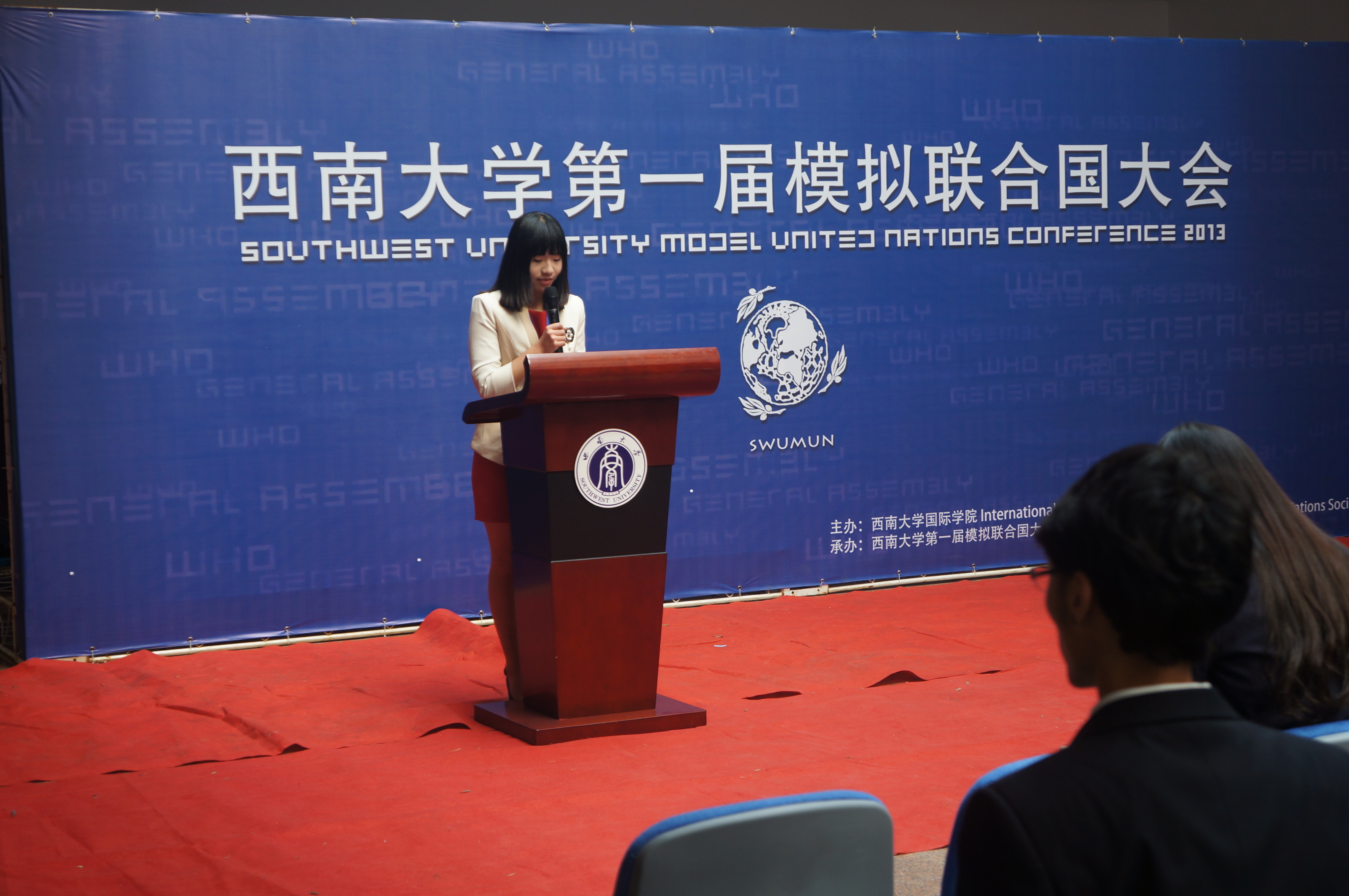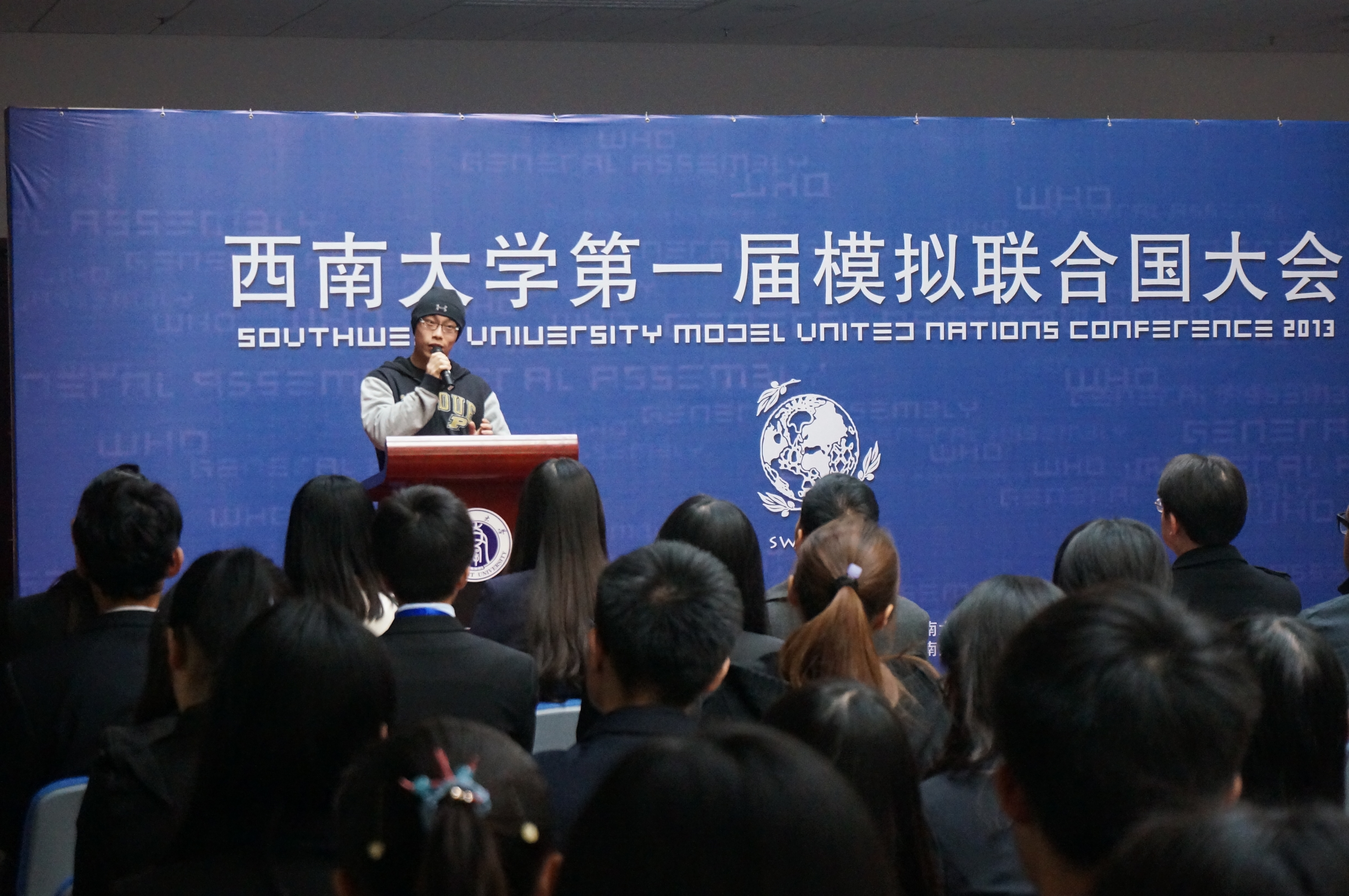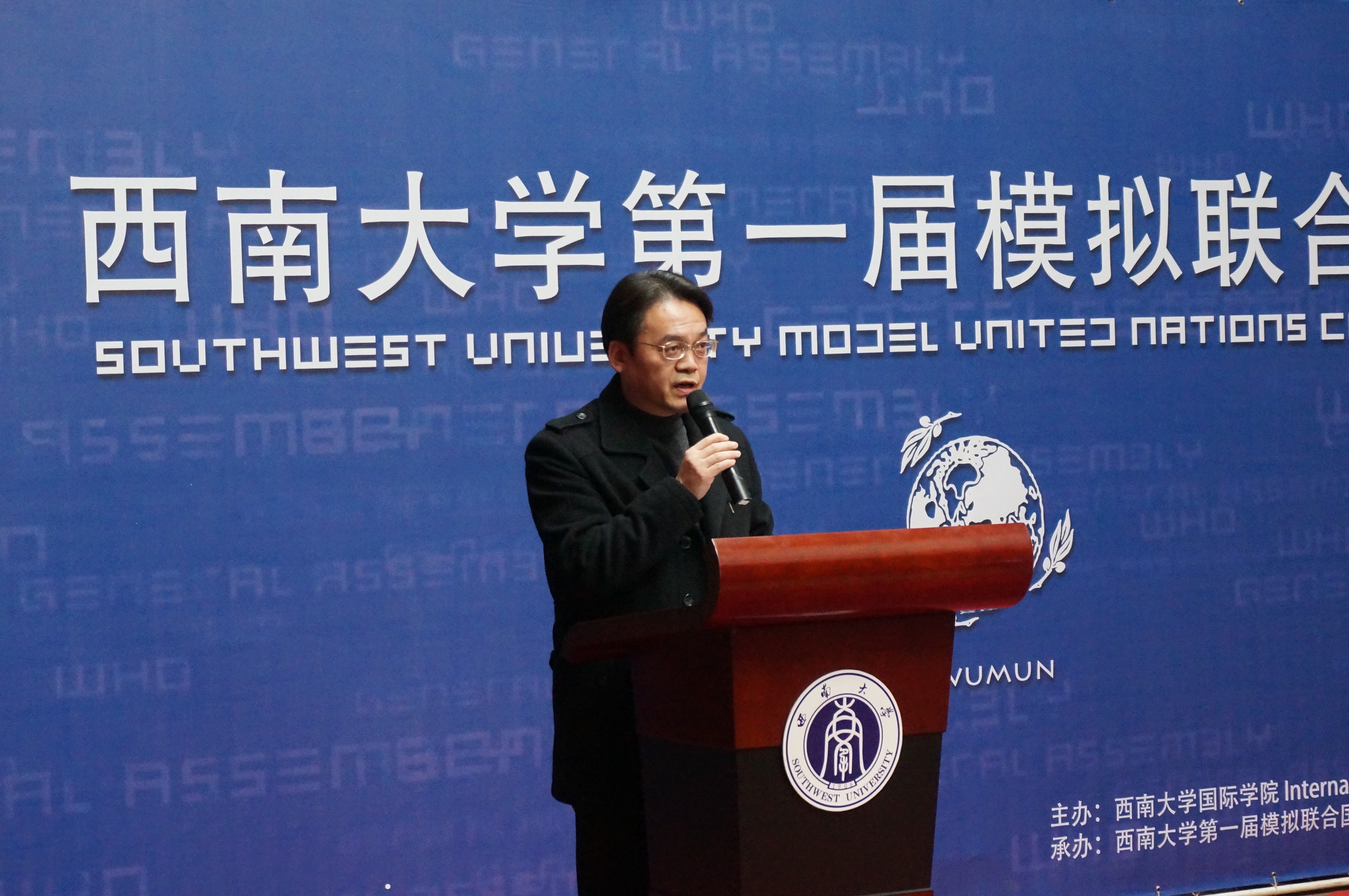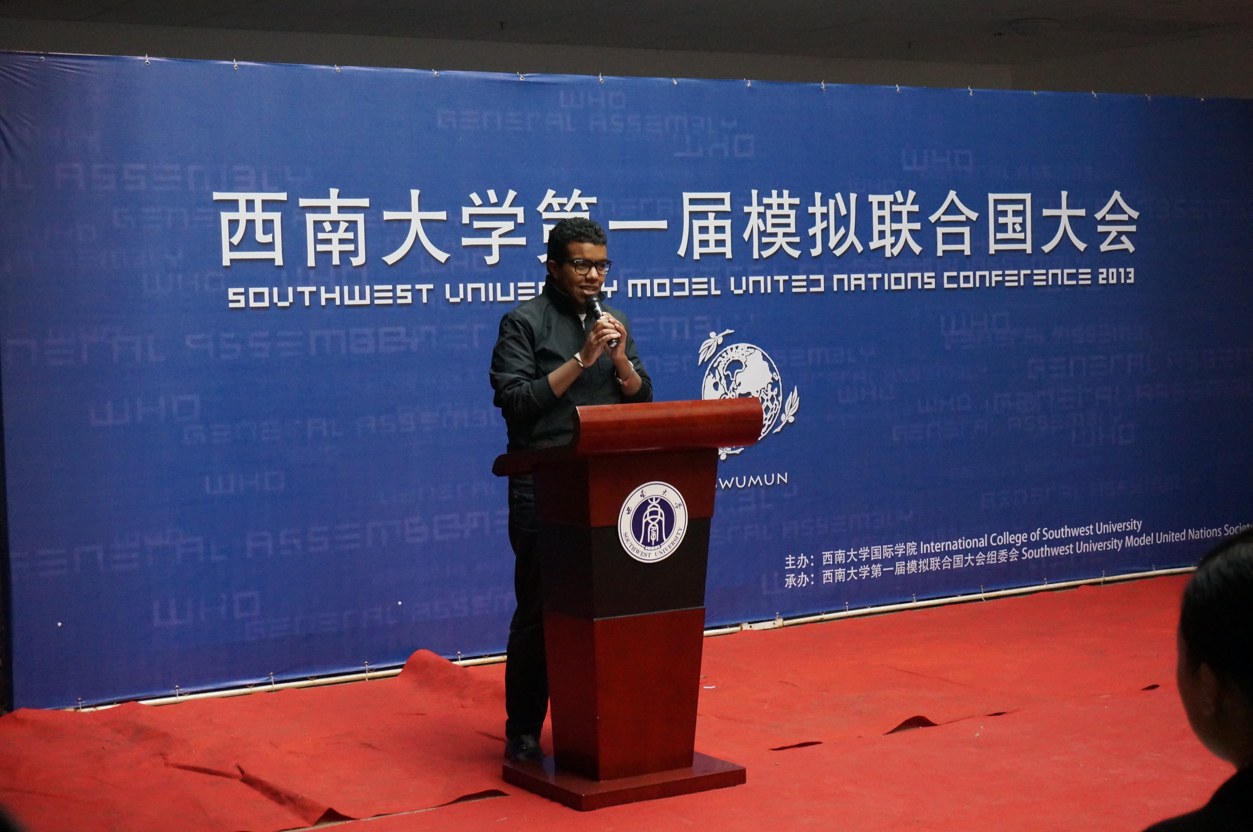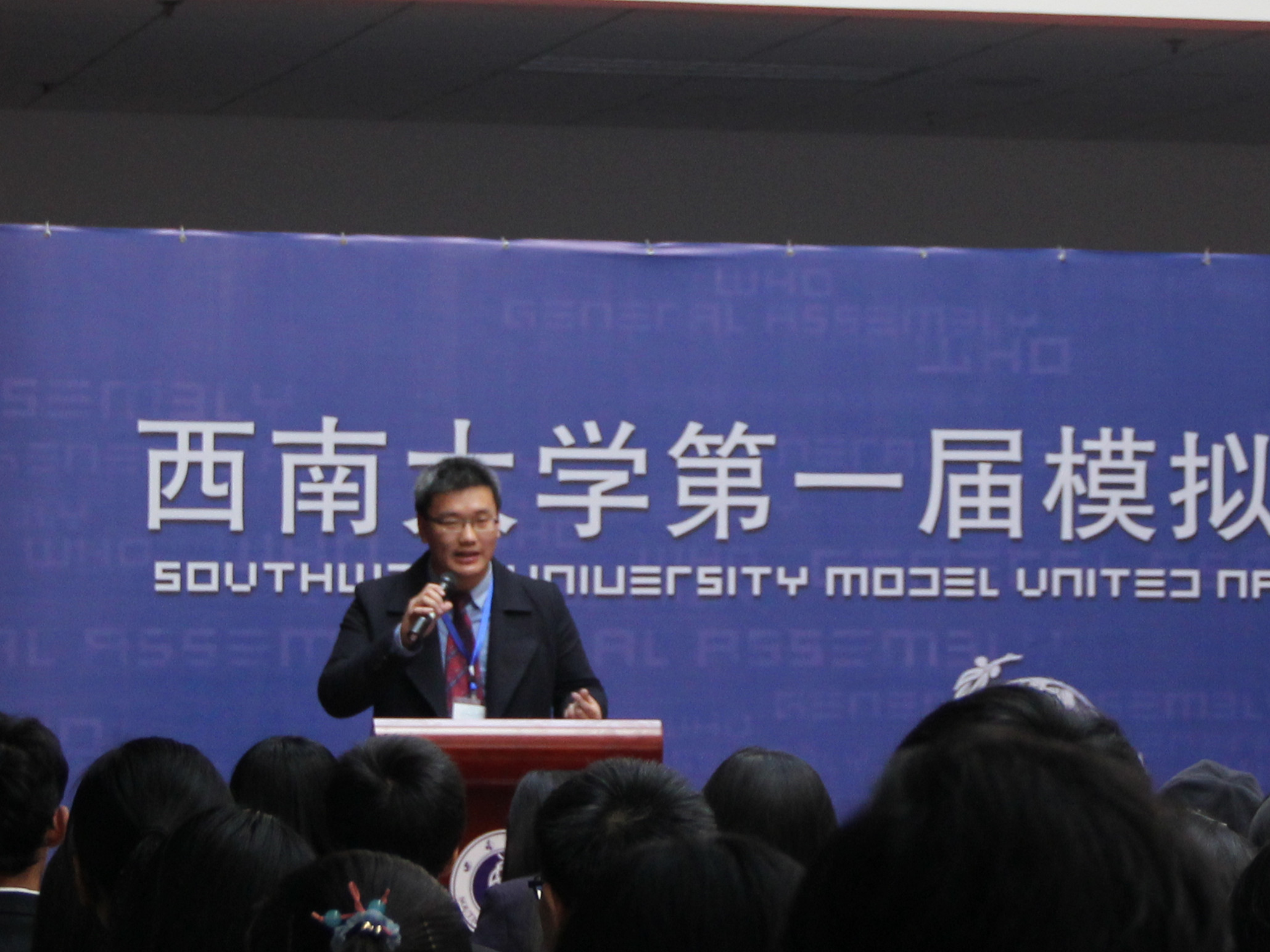 刘经理的讲话从模联对老员工的益处入手,就知识的增加和能力的提高进行了阐述,并介绍了本次大会的议题,他还对参会同学提出了殷切的希望。希望他们在两天的会议中“积极思考,畅所欲言,沟通合作,激扬风采,为世界的和平与发展贡献一份心力。用模拟的会议谱写真实蓝图。”紧接着,suncitygroup太阳集团第一届模拟联合国大会秘书长袁晔发表了讲话,他以全英文的形式向大家介绍了本次模拟联合国大会的主要内容,回忆了自己和模联的故事,讲述了西大模联发展的心路历程和大会筹备过程中的切身感受。最后,他对众多付出辛勤与汗水的幕后工作人员表示了衷心的感谢。