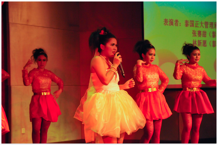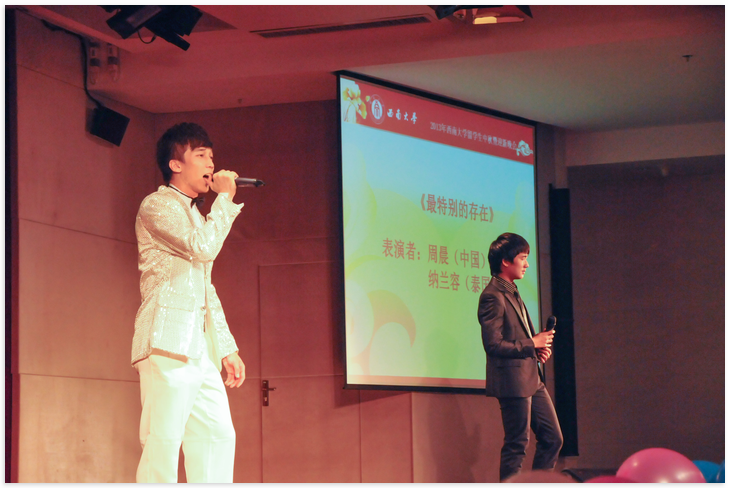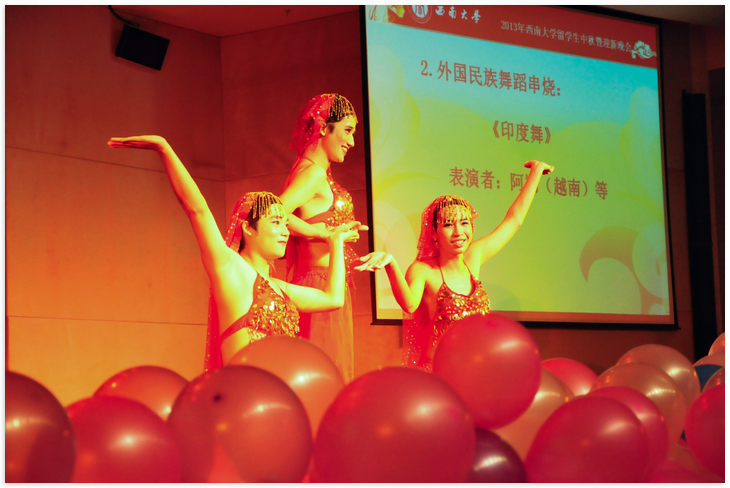 受邀参加此次盛典的有suncitygroup太阳集团总支书记兼副经理刘猛、副经理张家政,美国圣约翰大学教师Paul Albert,以及suncitygroup太阳集团外国专家代表和suncitygroup太阳集团全体教职员工。主持阵容也颇具国际范儿:来自埃及的黄阿里、韩国的朴秀海、泰国的纳兰容和中国的周晨。这是一场国际视听盛宴。泰国孔敬大学的职工林楚方等同学衣着美丽的泰国服饰,为观众演绎了优美多姿的泰国舞蹈;还有婀娜多姿的印度舞,委婉动听的越南北部民歌,以及由非洲职工带来的《非洲风情舞KINDOKI》;俄罗斯女孩丁洁演唱的《At Last》更是让观众直呼这是《俄罗斯好声音》。圣约翰班的同学们以他们的热情,点燃了现场的气氛,很多观众都随着他们的舞步尽情摇摆起来。