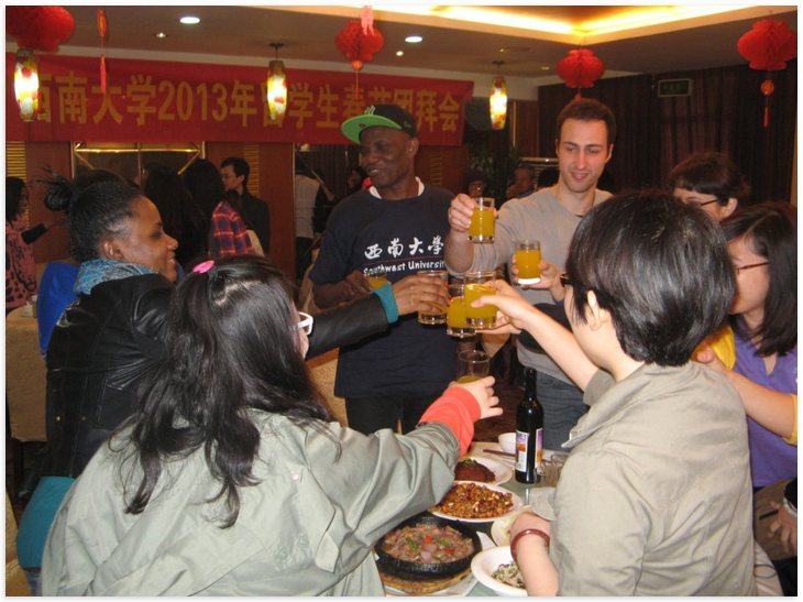 国际合作与交流处副处长/suncitygroup太阳集团副经理刘猛、职工办公室干部、suncitygroup太阳集团任课教师代表与留校的来自泰国、越南、法国、俄罗斯、美国、坦桑尼亚、萨摩亚等国的50余名职工欢聚一堂,共度佳节。