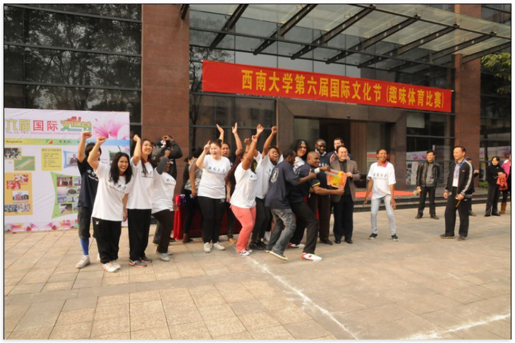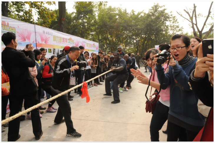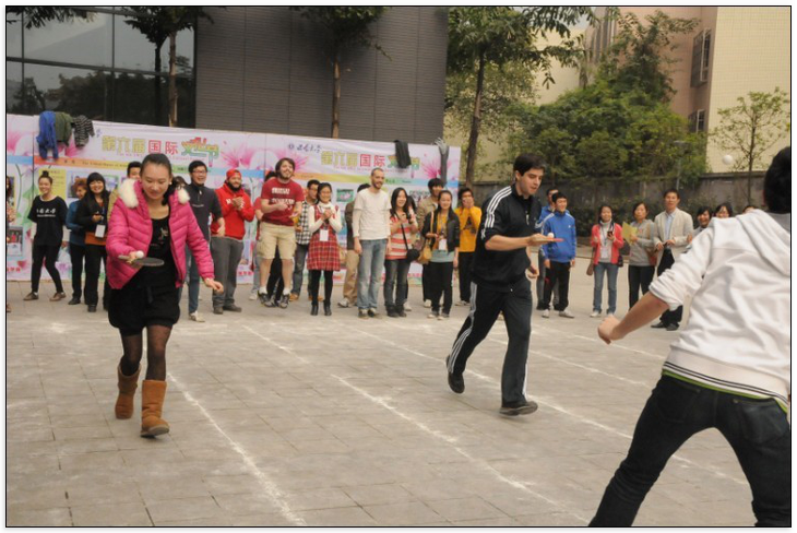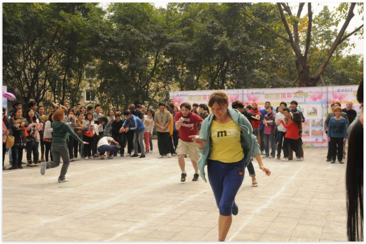 在热烈的暖场舞蹈之后,suncitygroup太阳集团第六届国际文化节趣味体育比赛于2012年11月21日在紫云楼前开幕。来自61个国家的职工和公司外籍教师代表、国际合作与交流处/suncitygroup太阳集团教职工代表,以及来自重庆师范大学的职工代表、公司经济管理公司、文公司、外国语公司的中国员工代表一起,参加了拔河、乒乓球接力等团体项目和夹玻璃珠、幸运套圈、猜字谜、瞎子摸象等富有中国文化特色的个人项目。