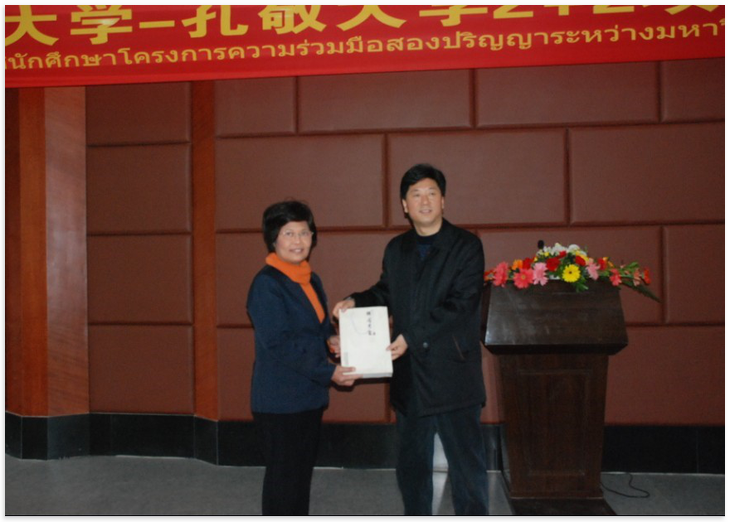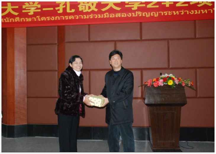 主管国际交流的suncitygroup太阳集团副董事长靳玉乐教授同孔敬大学人文公司经理兼孔子公司泰方经理互赠礼物